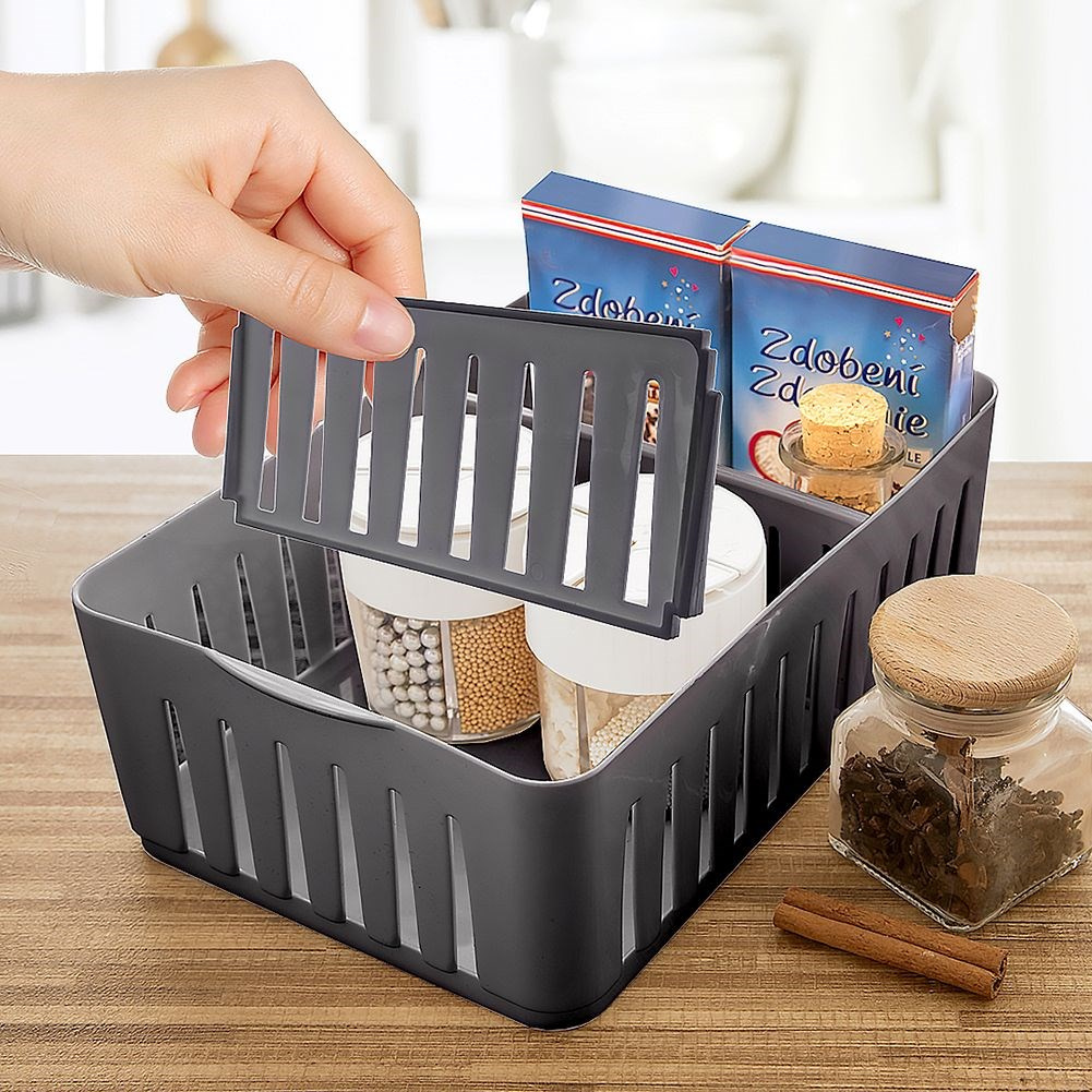- KUCHENNY - Pojemnik kuchenny z przegródkami o wymiarze 24,5 x 16 x 8 cm. Idealny do przechowywania torebek z przyprawami.