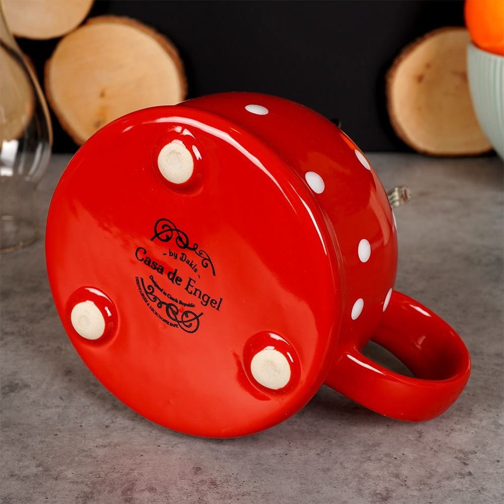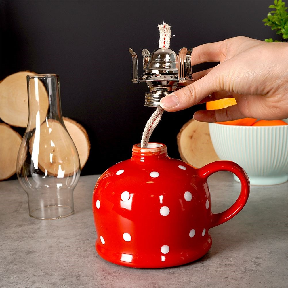 • Lampa naftowa wykonana ze szkła oraz ceramiki w efektownym czerwonym kolorze z białymi kropkami. Posiada regulowany knot a zdejmowany klosz ułatwi zapalanie.