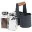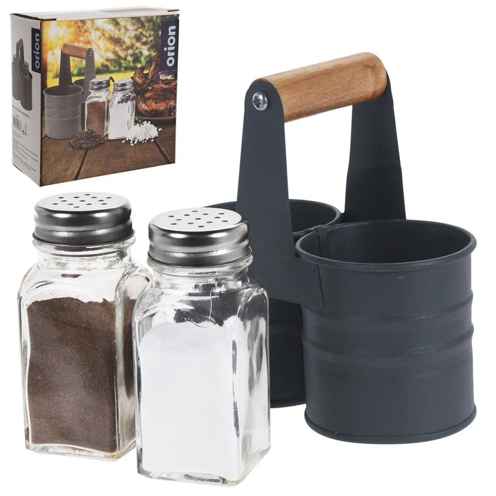 • WYGODNY - Szklane pojemniki na sól i pieprz umieszczone są w wygodnym do przenoszenia metalowym stojaku w kolorze szarym z drewnianą rączką.