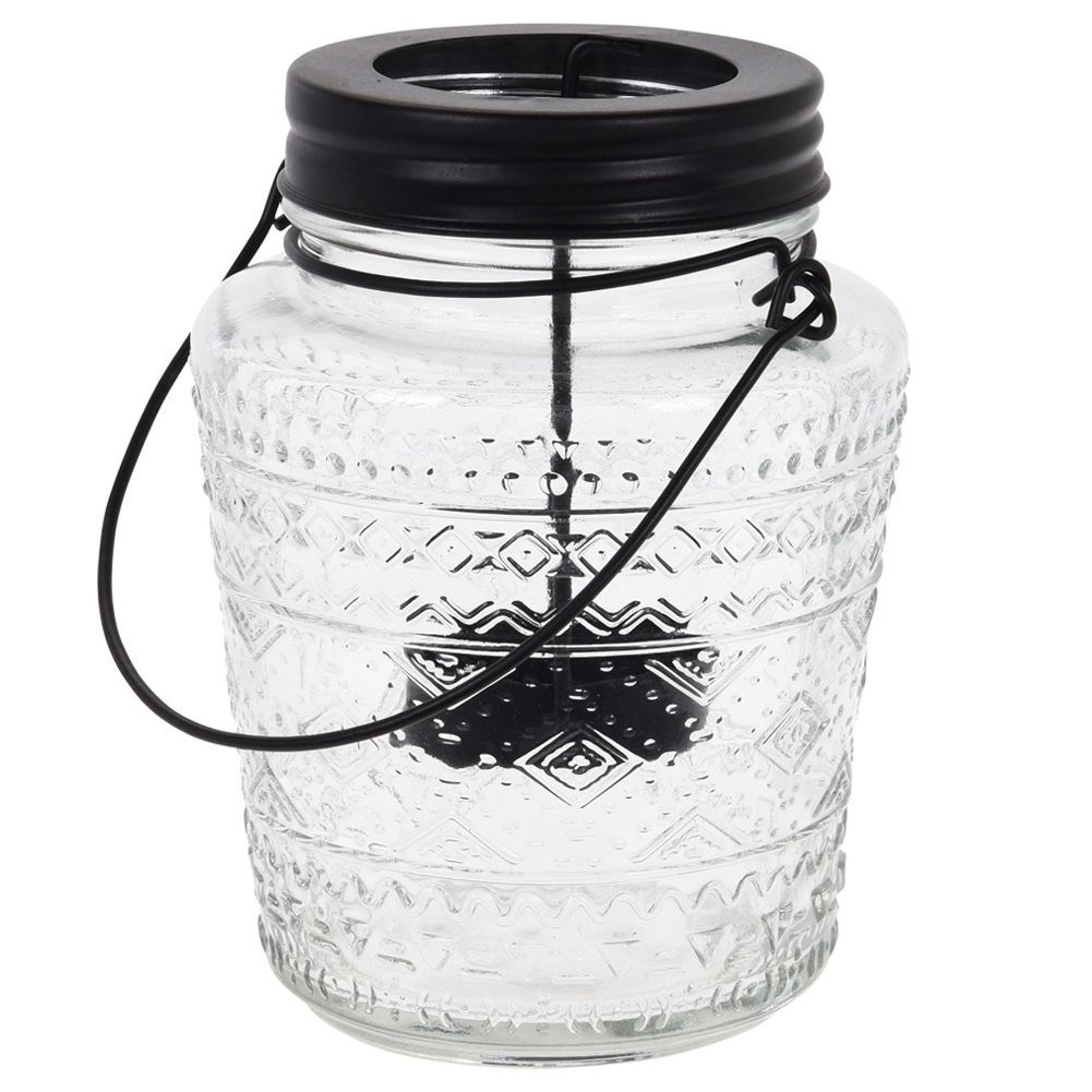 - SOLIDNY - Lampion wykonany z przezroczystego szkła, które posiada tłoczony wzór. Wkład na świecę i uchwyt wykonane z metalu w kolorze czarnym.