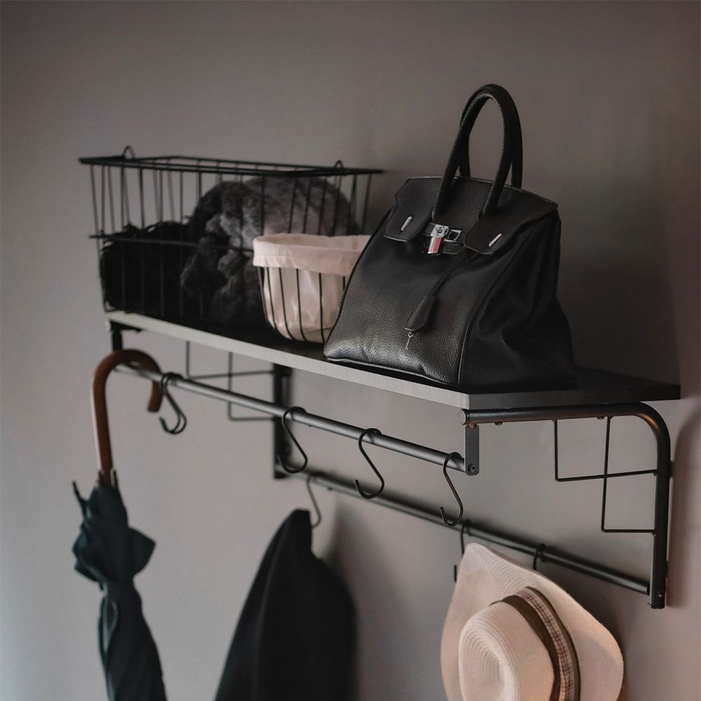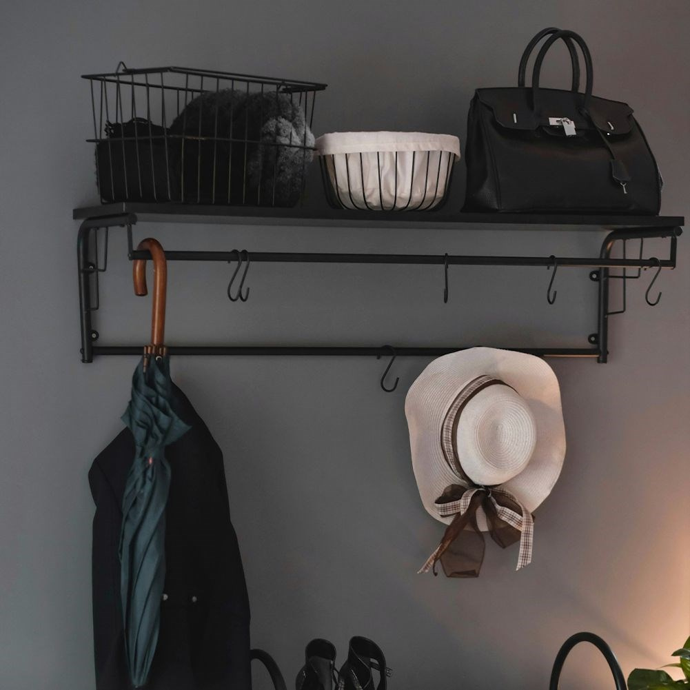 - SOLIDNA - Stelaż i wieszak wykonany z metalu w czarnym kolorze, a półka z drewna malowanego na czarno. Półka jest solidna, dzięki czemu żaden z elementów nie będzie się wyginać.