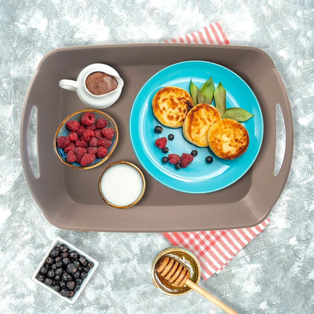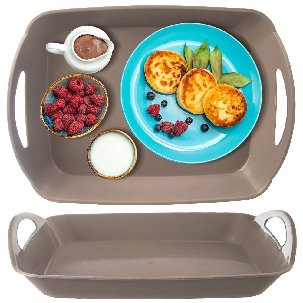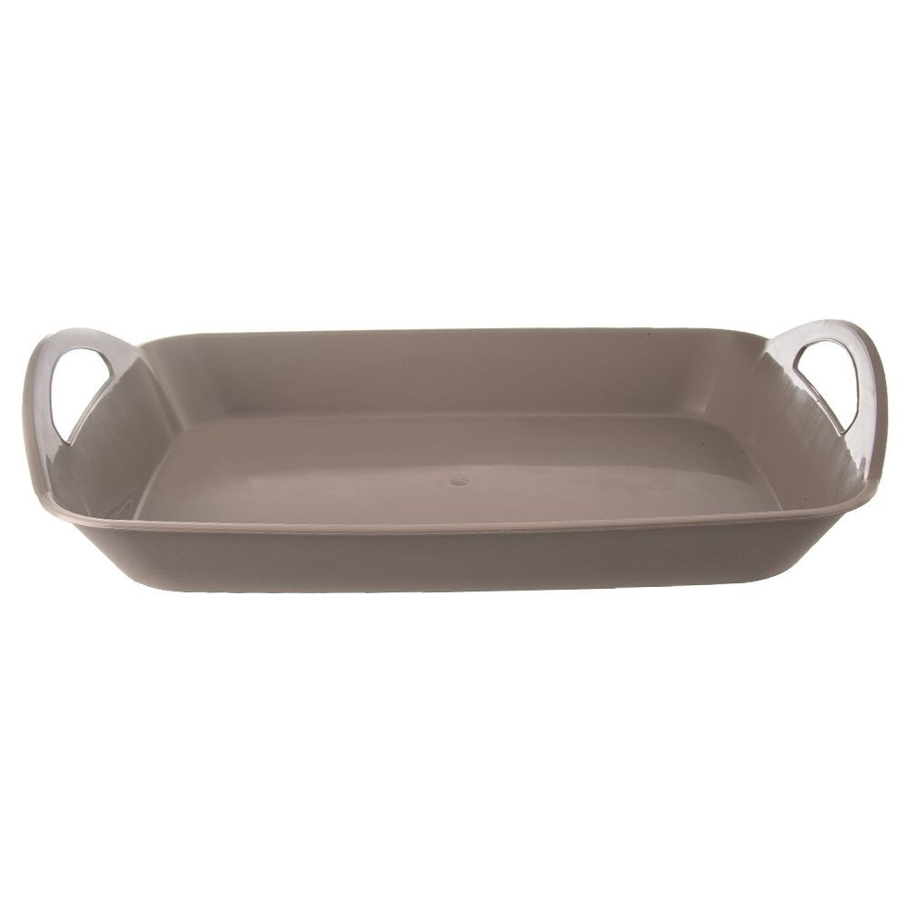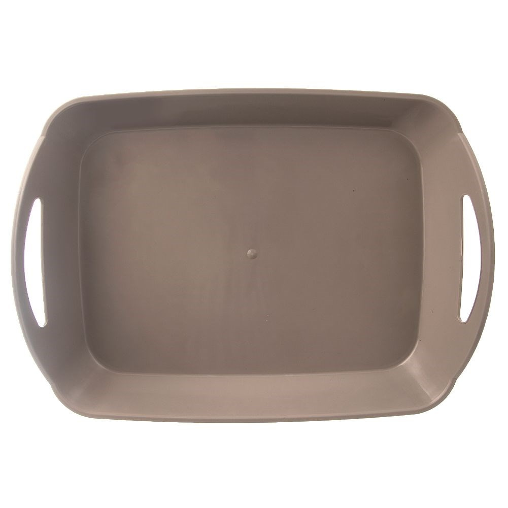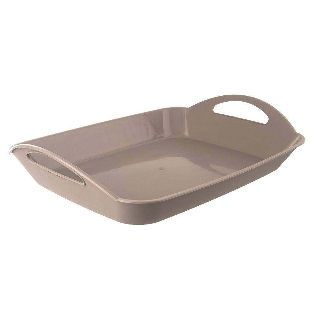 • Prostokątna taca kuchenna. Wyposażona w dwa poręczne uchwyty. Wykonana z wysokiej jakości tworzywa w kolorze szarym. Idealna do serwowania.