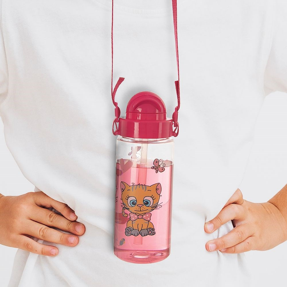 - DZIECIĘCA - Butelka ze słomką oraz uszczelką o pojemności 490 ml w formie wygodnego bidonu. Butelka posiada motyw kotka. Butelka ma wysokość 20 cm a średnicę 7 cm. W zestawie również pasek do zawieszenia butelki.
