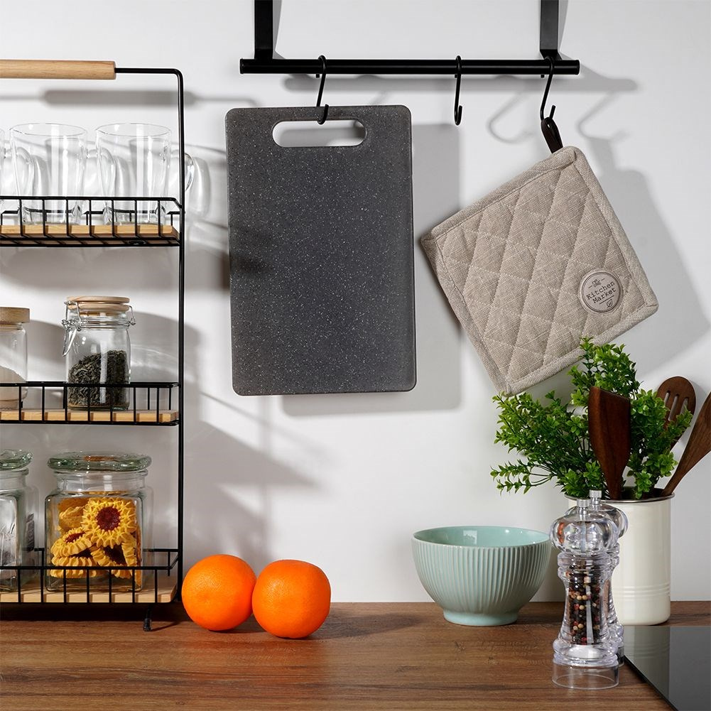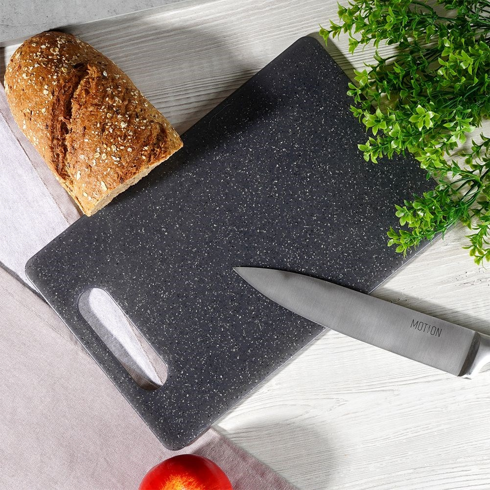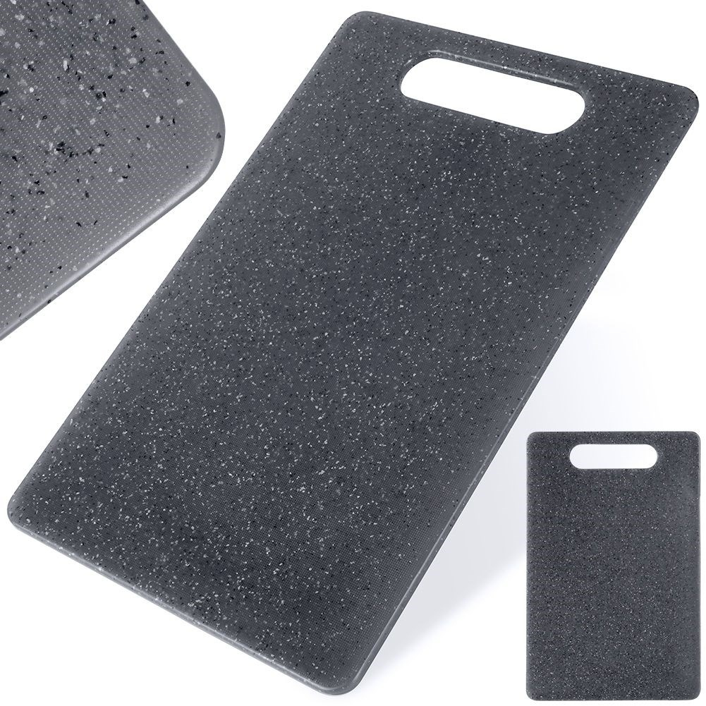 • Deska do krojenia z uchwytem, nie chłonie zapachów poprzednio pokrojonej żywności, nie nasiąka płynami. Wyglądem imituje granit.