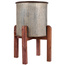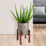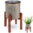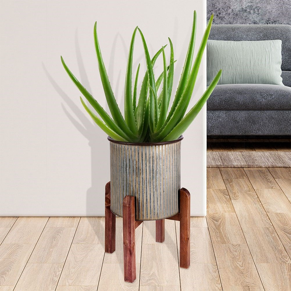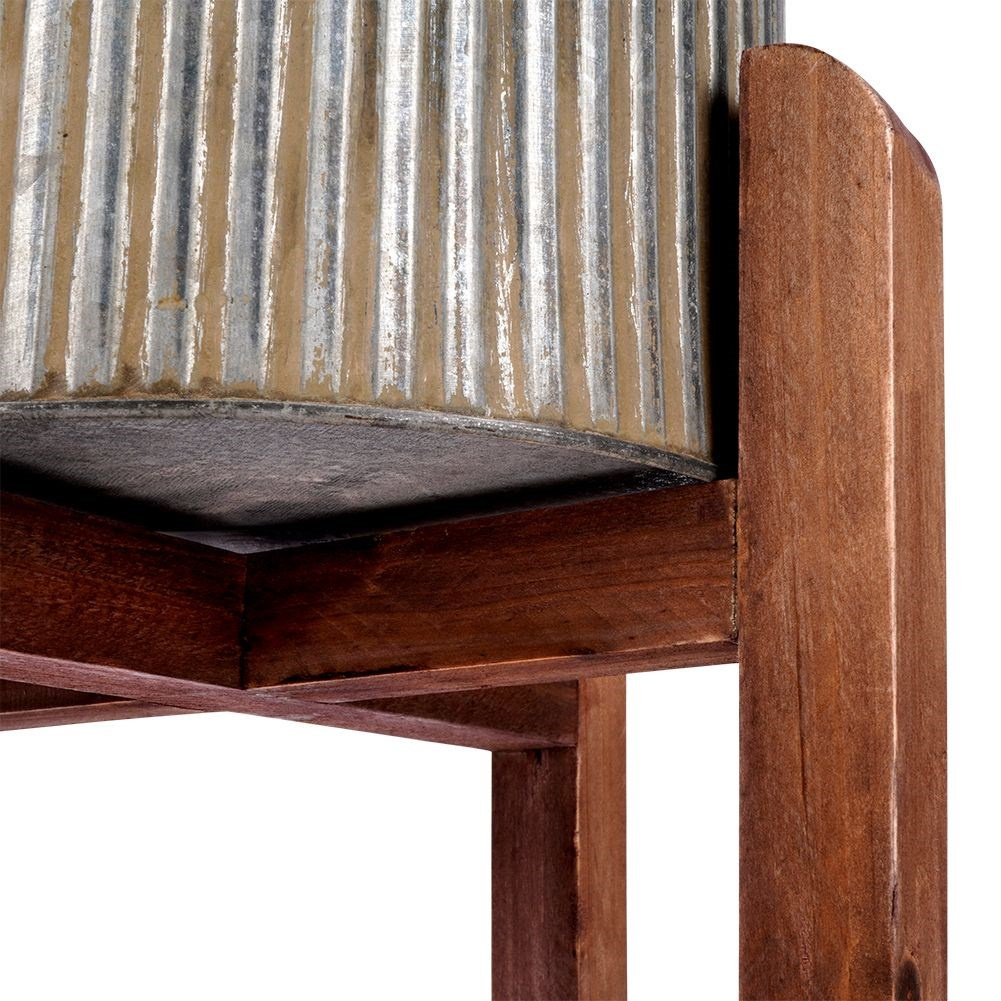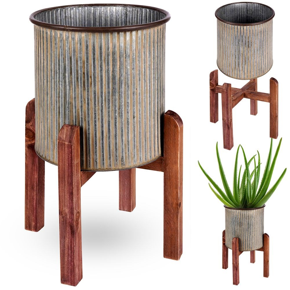 - STALOWA - Wykonana z wysokiej jakości stali w srebrnym kolorze z żebrowaną powierzchnią. Osłonka na doniczkę utrzymana jest w postarzanym stylu. Stelaż wykonany z drewna o naturalnym wyglądzie. Idealna do postawienia na parapecie lub na podłodze, stoliku czy komodzie.