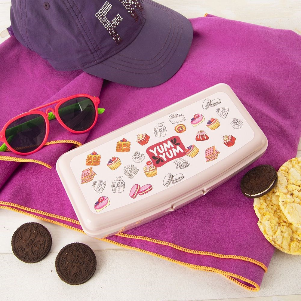 - SOLIDNY - Pojemnik wykonany z wysokiej jakości tworzywa w kolorze różowym. Dodatkowo posiada nadruk z motywem ciasteczek.