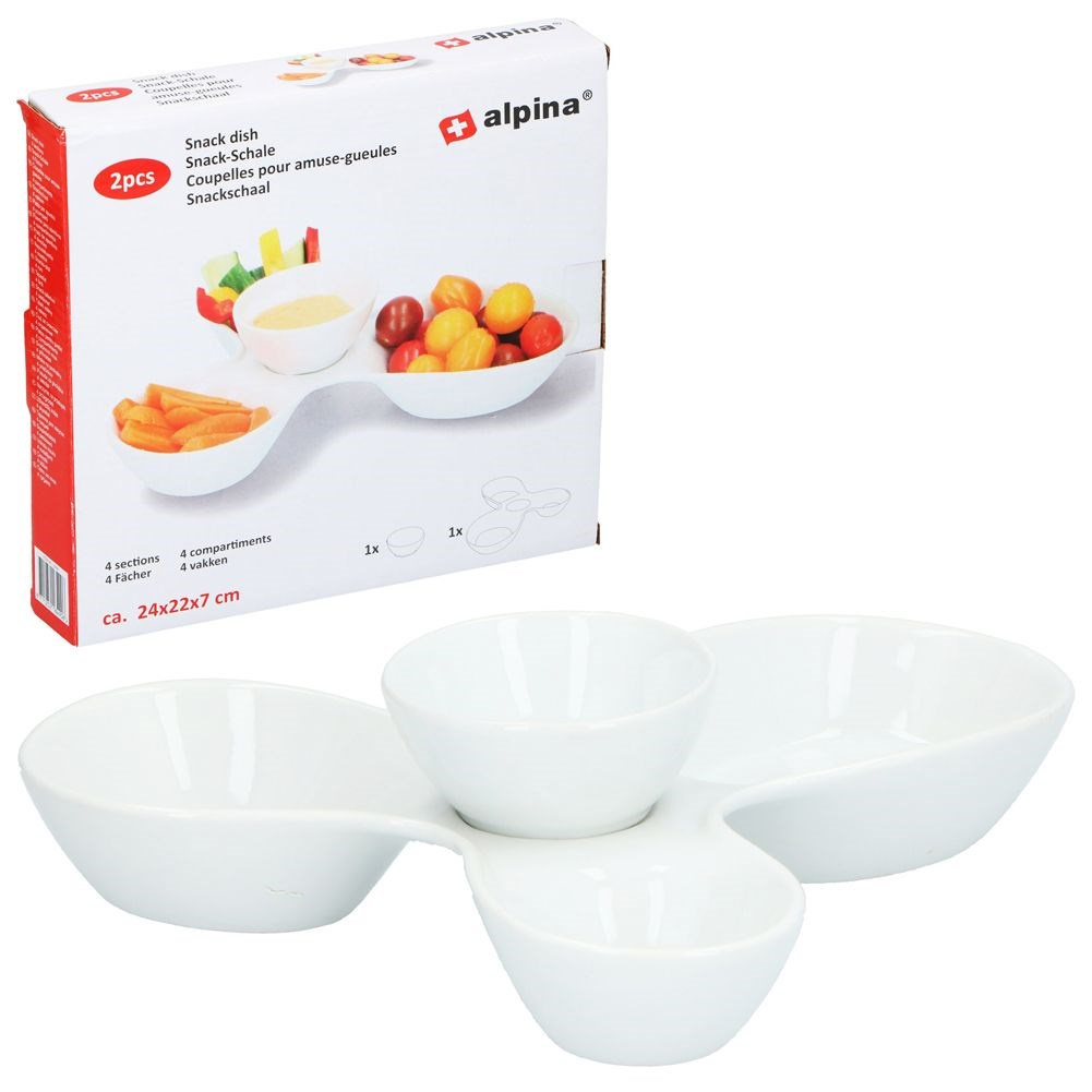 Efektowna miseczka na przekąski, dzielona na trzy różnej wielkości miseczki oraz jedną miseczkę ściąganą. Miseczka jest solidnie wykonana. Niezwykle przydatna w codziennym użytkowaniu, ale również podczas spotkań. Możemy serwować w niej słone przekąski, słodycze lub dipy. Biały kolor pięknie prezentuje się na stole, stanowiąc element dekoracyjny, który pasuje do pozostałej zastawy. Oryginalny produkt holenderskiej marki Alpina. Wyprodukowano zgodnie z europejskimi standardami.