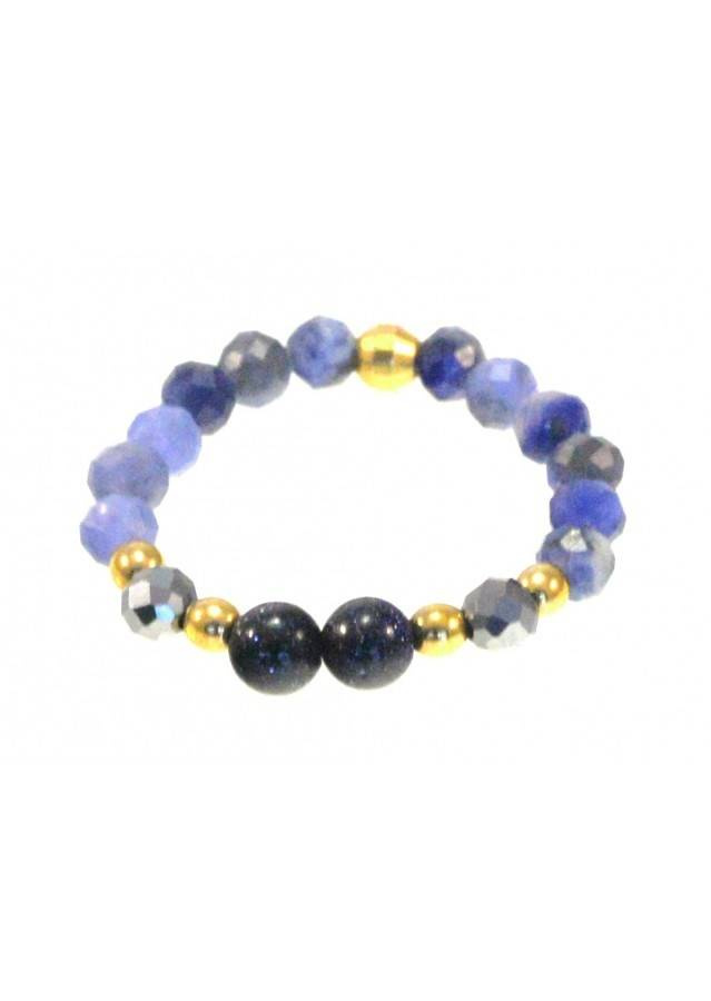 Kamień: Sodalit+ Teraherz+ Hematyt + Noc kairu+ srebrny element, pozłacane 24 karatowym żółtym złotem Pierścionek wykonany na bardzo wytrzymałej gumce, odpornej na uszkodzenia. Rozmiar kamienia: 2/3/4 mm Rozmiar uniwersalny. Produkt wykonywany ręcznie