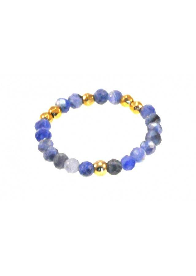 Kamień: Sodalit+ Hematyt  + srebrny element, pozłacane 24 karatowym żółtym złotem Pierścionek wykonany na bardzo wytrzymałej gumce, odpornej na uszkodzenia.  Rozmiar kamienia: 2 mm Rozmiar uniwersalny. Produkt wykonywany ręcznie