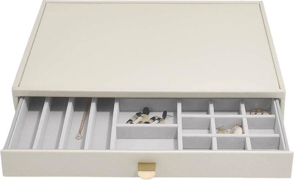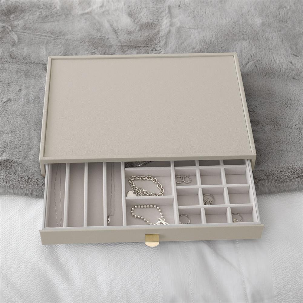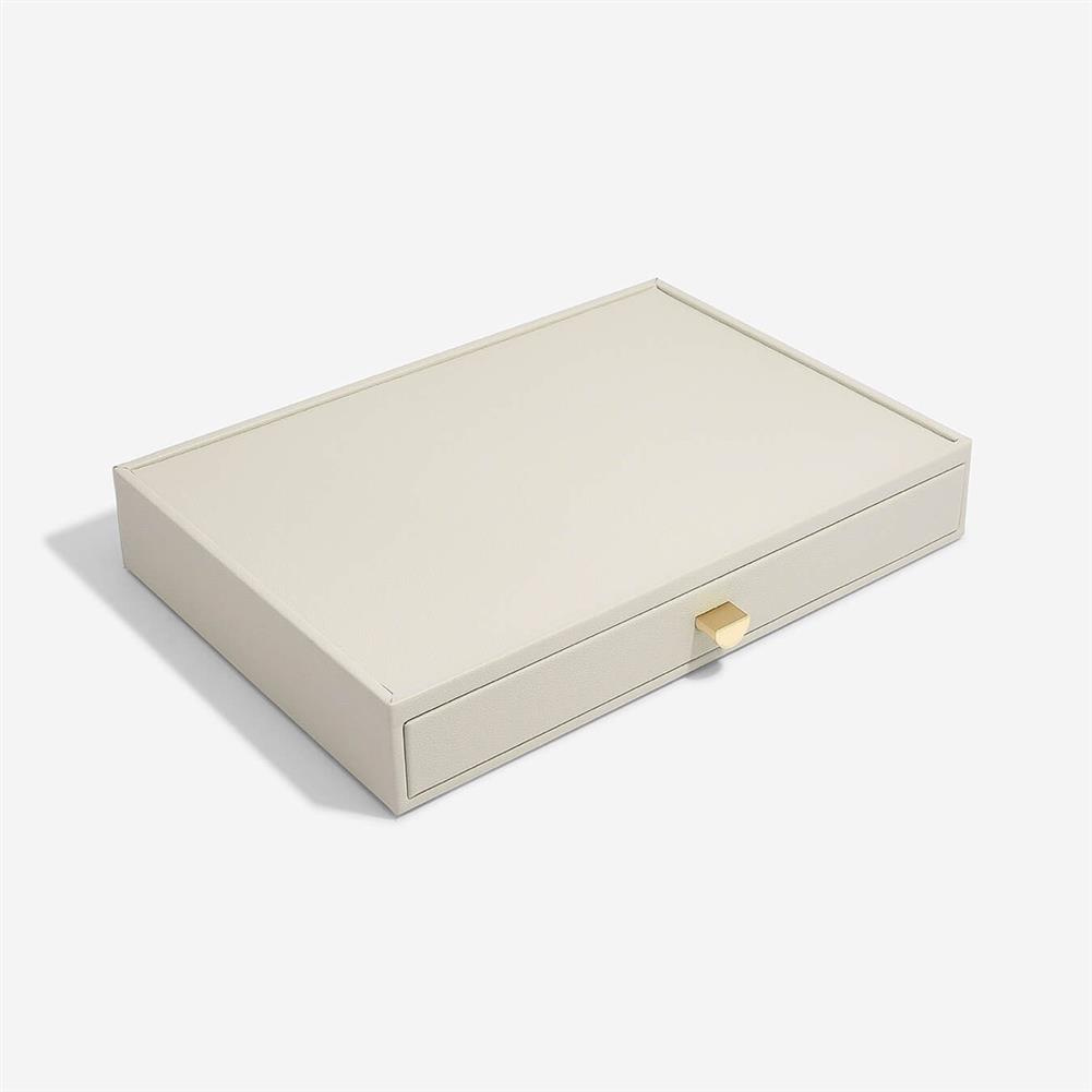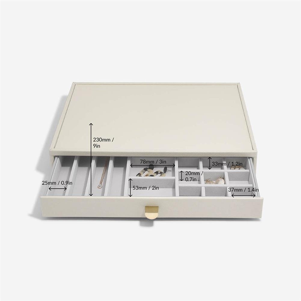Pudełka na biżuterię Stackers zostały zaprojektowane tak, aby możliwe było stworzenie swojej własnej kombinacji, wybierając warstwy i akcesoria najlepiej pasujące do kolekcji biżuterii. Pudełko na biżuterię może być również idealnym rozwiązaniem do przechowywania w szufladzie, jeśli chcesz zachować porządek na toaletce. Warstwa na zegarki i akcesoria to świetny wybór dla osób, które chcą bezpiecznie przechowywać większe elementy. Możesz również dodać wkładkę na pierścionki, poduszkę na zegarki lub oba te elementy, aby bezpiecznie przechowywać biżuterię. Wskazówka: Podróżne pudełko na biżuterię w rozmiarze Medium zostało zaprojektowane tak, aby idealnie pasowało do tej warstwy, gdy nie jest używane.