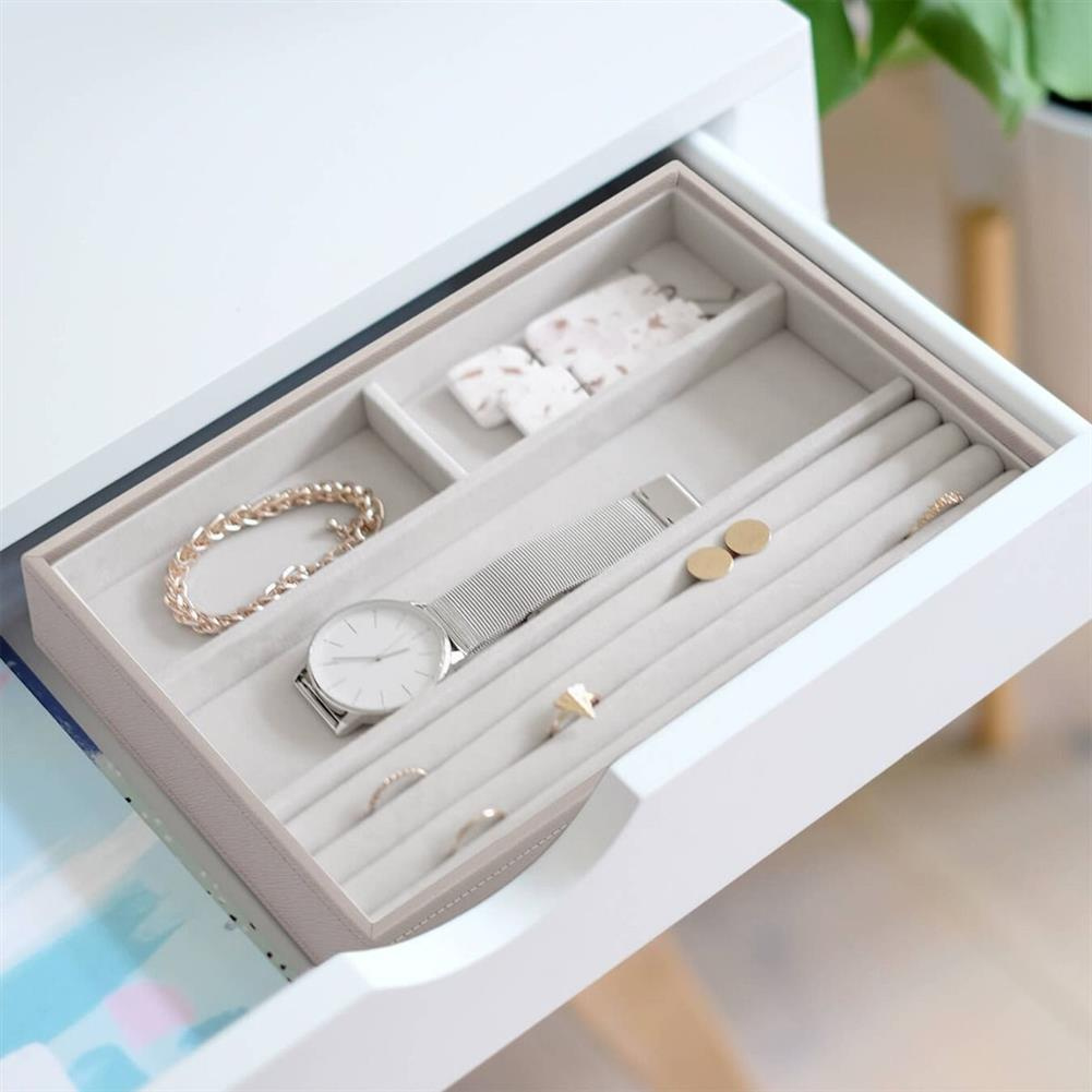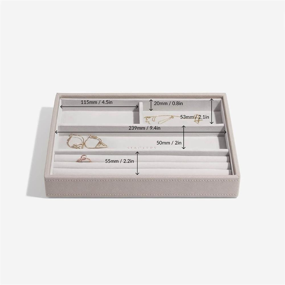 Pudełka na biżuterię Stackers zostały zaprojektowane tak, aby możliwe było stworzenie swojej własnej kombinacji, wybierając warstwy i akcesoria najlepiej pasujące do Twojej kolekcji. Koniec z gubieniem kolczyków i plątaniem się naszyjników! Pudełko Stackers Classic to doskonały punkt wyjścia do stworzenia szkatułki lub jako samodzielny element na toaletce. Przechowuj swoją ulubioną biżuterię bezpiecznie i pięknie zorganizowaną dzięki wszechstronnym przegródkom na pierścionki, kolczyki, naszyjniki i bransoletki. W miarę, jak Twoja kolekcja się powiększa, po prostu dodaj warstwy, które najlepiej pasują do nowych elementów, niezależnie od tego, czy potrzebujesz więcej miejsca na naszyjniki, pierścionki czy charmsy, znajdziesz pudełko, które spełni Twoje oczekiwania. Marka Stackers specjalizuje się w niezwykle eleganckich i praktycznych szkatułkach oraz pudełkach na biżuterię damską i akcesoria męskie. W ofercie znajdują się wykonane z największą dokładnością pudełka oraz etui (również podróżne) do przechowywania biżuterii, zegarków, okularów czy spinek do mankietów. Ogromną zaletą organizerów jest ich modułowość - w zależności od potrzeby możemy dołożyć kolejne piętra lub szufladki, pokrywki oraz wkładki, aby zyskać dodatkową przestrzeń na akcesoria. Angielska marka Stackers to producent stylowych akcesoriów służących do przechowywania biżuterii i porządkowania przestrzeni. Produkty są wykonane z największą dbałością o jakość, dopracowane w formie i przemyślane. Wiele z nich można łączyć ze sobą, aby dopasować je do indywidualnych potrzeb. Dzięki eleganckiej formie sprawdzą się również jako doskonały upominek.