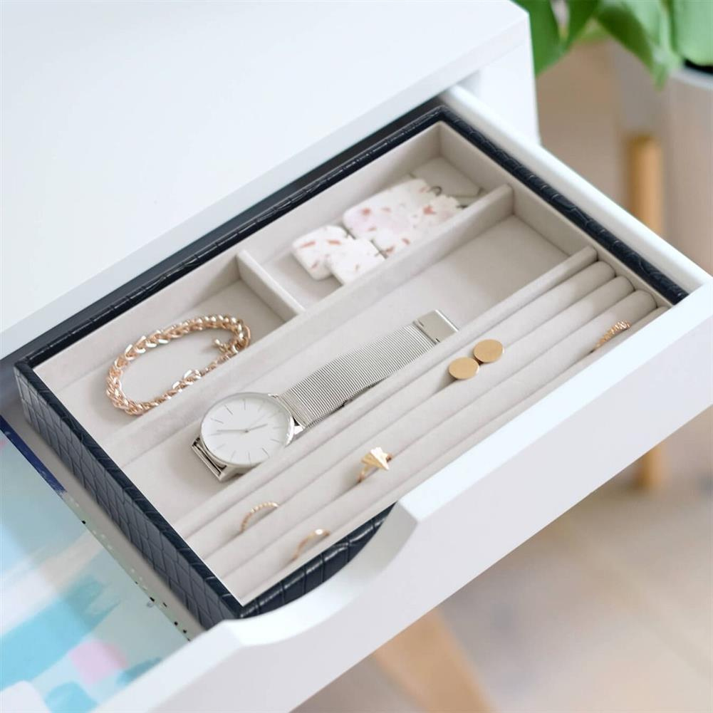 Szklana Szkatułka na biżuterię Stackers i z miedzianymi akcentami została zaprojektowane tak, aby nadać Twojemu domowi stylowy i praktyczny wygląd. Pudełko prezentować się będzie doskonale zarówno na komodzie w sypialni, jak na półce w łazience, eksponując bezcenną zawartość. Marka Stackers specjalizuje się w niezwykle eleganckich i praktycznych szkatułkach oraz pudełkach na biżuterię damską i akcesoria męskie. W ofercie znajdują się wykonane z największą dokładnością pudełka oraz etui (również podróżne) do przechowywania biżuterii, zegarków, okularów czy spinek do mankietów. Ogromną zaletą organizerów jest ich modułowość - w zależności od potrzeby możemy dołożyć kolejne piętra lub szufladki, pokrywki oraz wkładki, aby zyskać dodatkową przestrzeń na akcesoria. Angielska marka Stackers to producent stylowych akcesoriów służących do przechowywania biżuterii i porządkowania przestrzeni. Produkty są wykonane z największą dbałością o jakość, dopracowane w formie i przemyślane. Wiele z nich można łączyć ze sobą, aby dopasować je do indywidualnych potrzeb. Dzięki eleganckiej formie sprawdzą się również jako doskonały upominek.