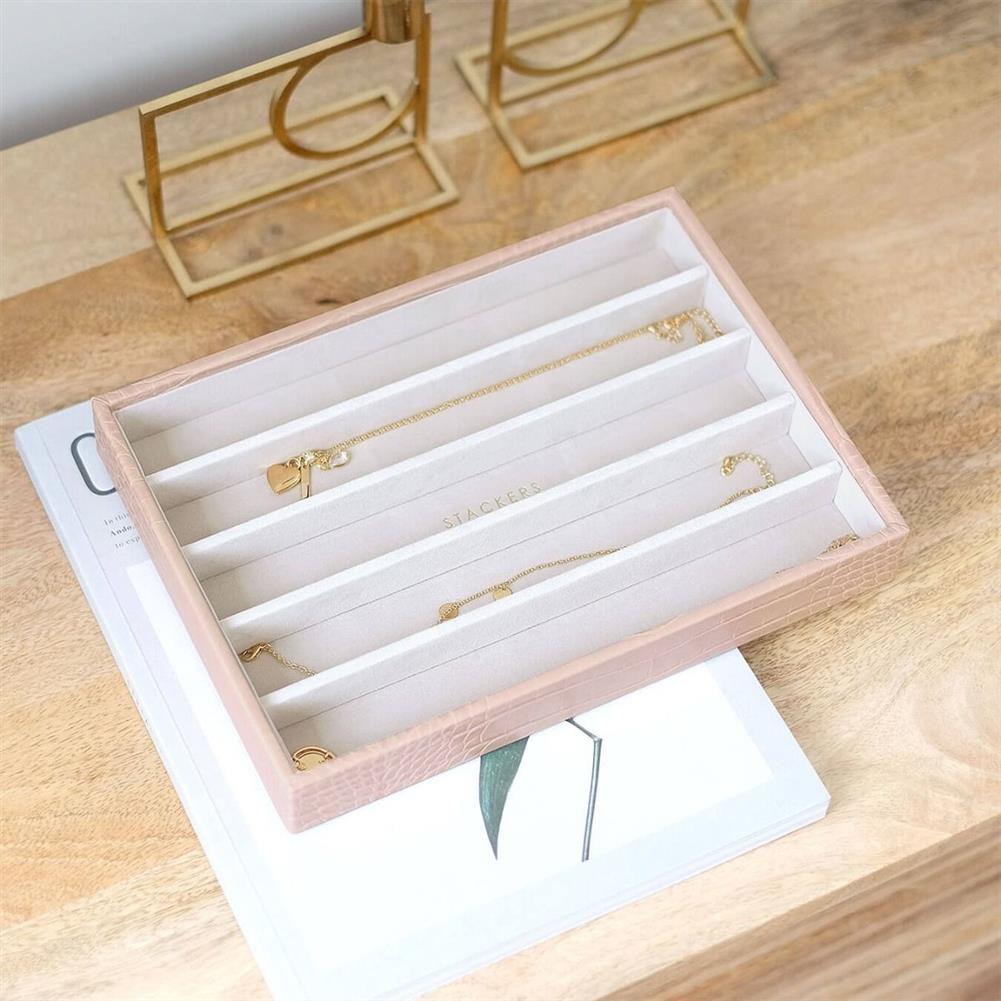 Pudełka na biżuterię Stackers zostały zaprojektowane tak, abyś mogła stworzyć swoje własne kombinacje, wybierając warstwy i akcesoria najlepiej pasujące do Twojej wyjątkowej kolekcji. Pudełko może być również idealnym rozwiązaniem do przechowywania biżuterii w szufladzie, jeśli chcesz zachować porządek na toaletce. Potrzebujesz miejsca do przechowywania większych akcesoriów? To pudełko może być właśnie tym, czego potrzebujesz. Jest to również doskonałe miejsce dla pamiątkowych opakowań prezentowych, które chcesz zachować. Dobra rada: dlaczego nie przechowywać akcesoriów do włosów w piękny sposób? Zorganizowanie ich w tym pudełku pozwoli zaoszczędzić miejsce. Marka Stackers specjalizuje się w niezwykle eleganckich i praktycznych szkatułkach oraz pudełkach na biżuterię damską i akcesoria męskie. W ofercie znajdują się wykonane z największą dokładnością pudełka oraz etui (również podróżne) do przechowywania biżuterii, zegarków, okularów czy spinek do mankietów. Ogromną zaletą organizerów jest ich modułowość - w zależności od potrzeby możemy dołożyć kolejne piętra lub szufladki, pokrywki oraz wkładki, aby zyskać dodatkową przestrzeń na akcesoria. Angielska marka Stackers to producent stylowych akcesoriów służących do przechowywania biżuterii i porządkowania przestrzeni. Produkty są wykonane z największą dbałością o jakość, dopracowane w formie i przemyślane. Wiele z nich można łączyć ze sobą, aby dopasować je do indywidualnych potrzeb. Dzięki eleganckiej formie sprawdzą się również jako doskonały upominek.