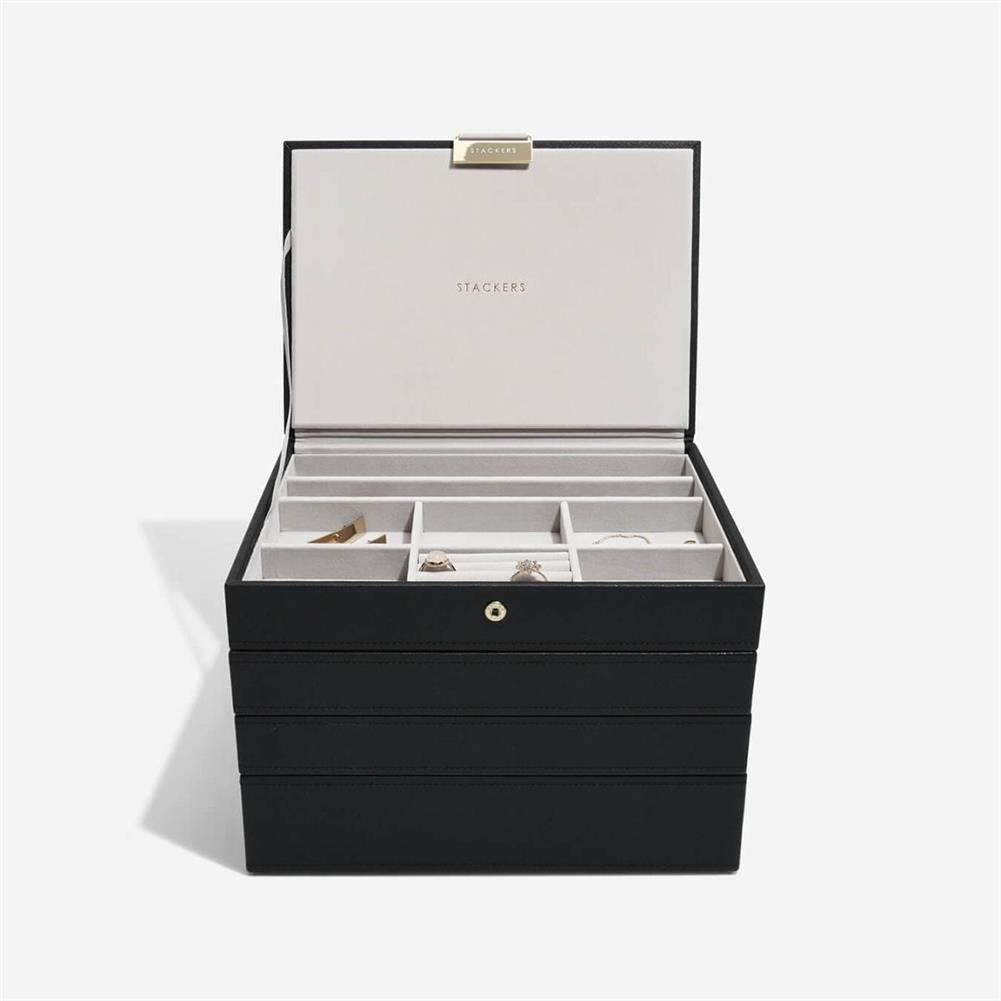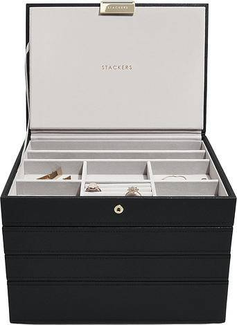 Marka Stackers specjalizuje się w niezwykle eleganckich i praktycznych szkatułkach oraz pudełkach na biżuterię damską i akcesoria męskie. W ofercie znajdują się wykonane z największą dokładnością pudełka oraz etui (również podróżne) do przechowywania biżuterii, zegarków, okularów czy spinek do mankietów. Ogromną zaletą organizerów jest ich modułowość - w zależności od potrzeby możemy dołożyć kolejne piętra lub szufladki, pokrywki oraz wkładki, aby zyskać dodatkową przestrzeń na akcesoria.