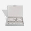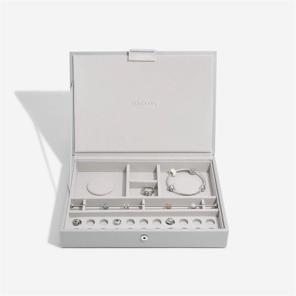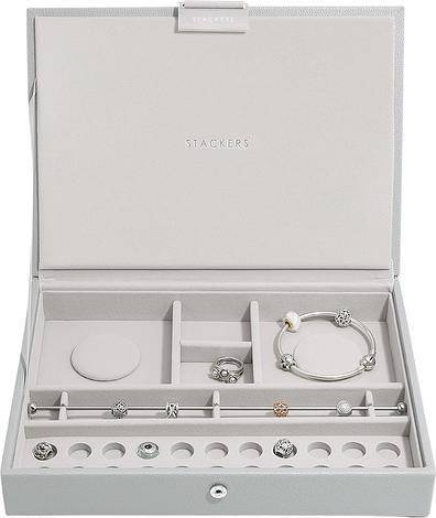 Szkatułka na charmsy Stackers classic z szufladą i szklaną pokrywą pięknie wyeksponuje Twoją biżuterię. Jest doskonałym punktem wyjścia dla każdego kolekcjonera charmsów. Sprawdzi się jako samodzielne pudełko na biżuterię lub część większej kombinacji w rozmiarze Classic. W pudełku znajdują się dwie podkładki pod bransoletki, 2 długie stojaki oraz dodatkowe miejsce do przechowywania wszystkich dodatkowych charmsów, które będą bezpiecznie i pięknie zorganizowane!