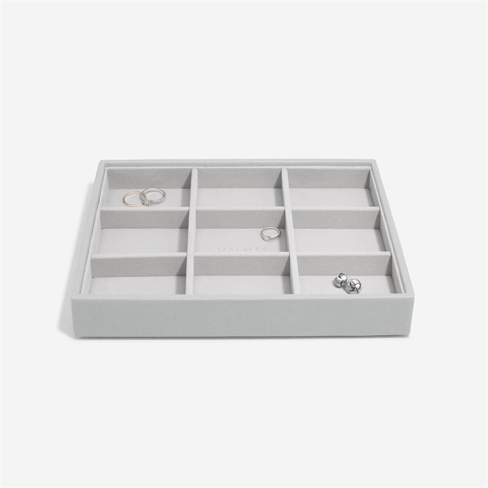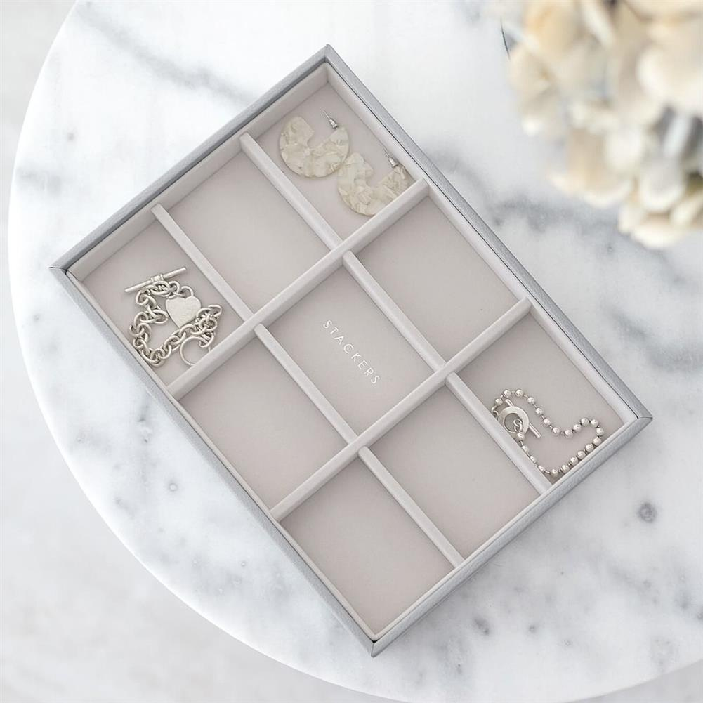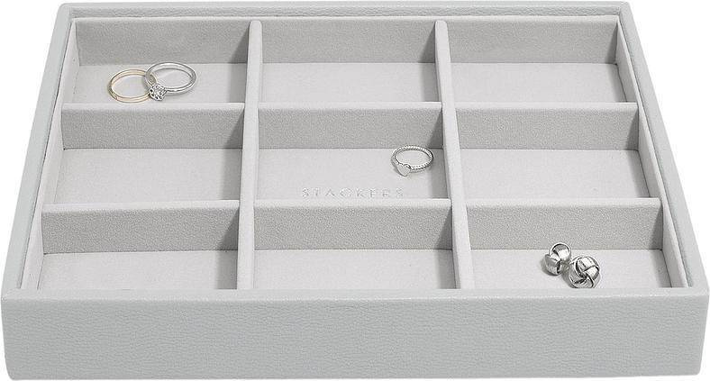 Szkatułka na biżuterię Stackers 9 komorowa classic jest idealna dla Twojej kolekcji, pięknie wyeksponuje zawartość a miękka, aksamitna wyściółka zapewni jej bezpieczeństwo i ochronę. Można ją układać w stos z dodatkowymi szufladami w rozmiarze Classic. Twoja kolekcja wciąż się powiększa? Nie ma problemu, dodaj tyle dodatkowych szuflad, ile potrzebujesz! Przechowuj swoje skarby bezpiecznie i pięknie zorganizowane dzięki uniwersalnym przegródkom na pierścionki, kolczyki, naszyjniki i bransoletki.