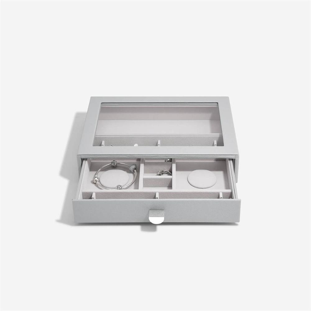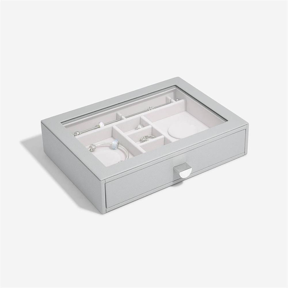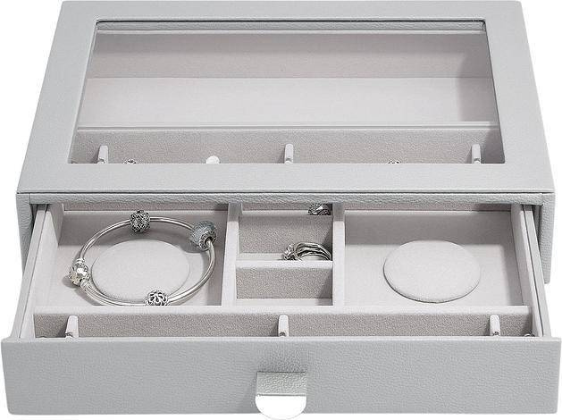 Nie będzie już wymówki dla braku organizacji Twojej biżuterii. Szkatułka na biżuterię Stackers classic z 2 szufladami jest idealna dla prawie każdej kolekcji. Gwarantuje dużą ilość miejsca na naszyjniki, pierścionki, kolczyki, zegarki i inne elementy, które będą pięknie zorganizowane i bezpieczne. Przezroczysta szklana pokrywa zapewnia widoczność i łatwy dostęp do ulubionych przedmiotów. Co więcej, możesz łatwo dodać kolejną warstwę szuflady na biżuterię, gdy Twoja kolekcja się powiększy! Pamiętaj, że możesz jeszcze lepiej dostosować swoje szuflady do potrzeb, dodając nowe warstwy i akcesoria. Marka Stackers specjalizuje się w niezwykle eleganckich i praktycznych szkatułkach oraz pudełkach na biżuterię damską i akcesoria męskie. W ofercie znajdują się wykonane z największą dokładnością pudełka oraz etui (również podróżne) do przechowywania biżuterii, zegarków, okularów czy spinek do mankietów. Ogromną zaletą organizerów jest ich modułowość - w zależności od potrzeby możemy dołożyć kolejne piętra lub szufladki, pokrywki oraz wkładki, aby zyskać dodatkową przestrzeń na akcesoria. Angielska marka Stackers to producent stylowych akcesoriów służących do przechowywania biżuterii i porządkowania przestrzeni. Produkty są wykonane z największą dbałością o jakość, dopracowane w formie i przemyślane. Wiele z nich można łączyć ze sobą, aby dopasować je do indywidualnych potrzeb. Dzięki eleganckiej formie sprawdzą się również jako doskonały upominek.