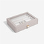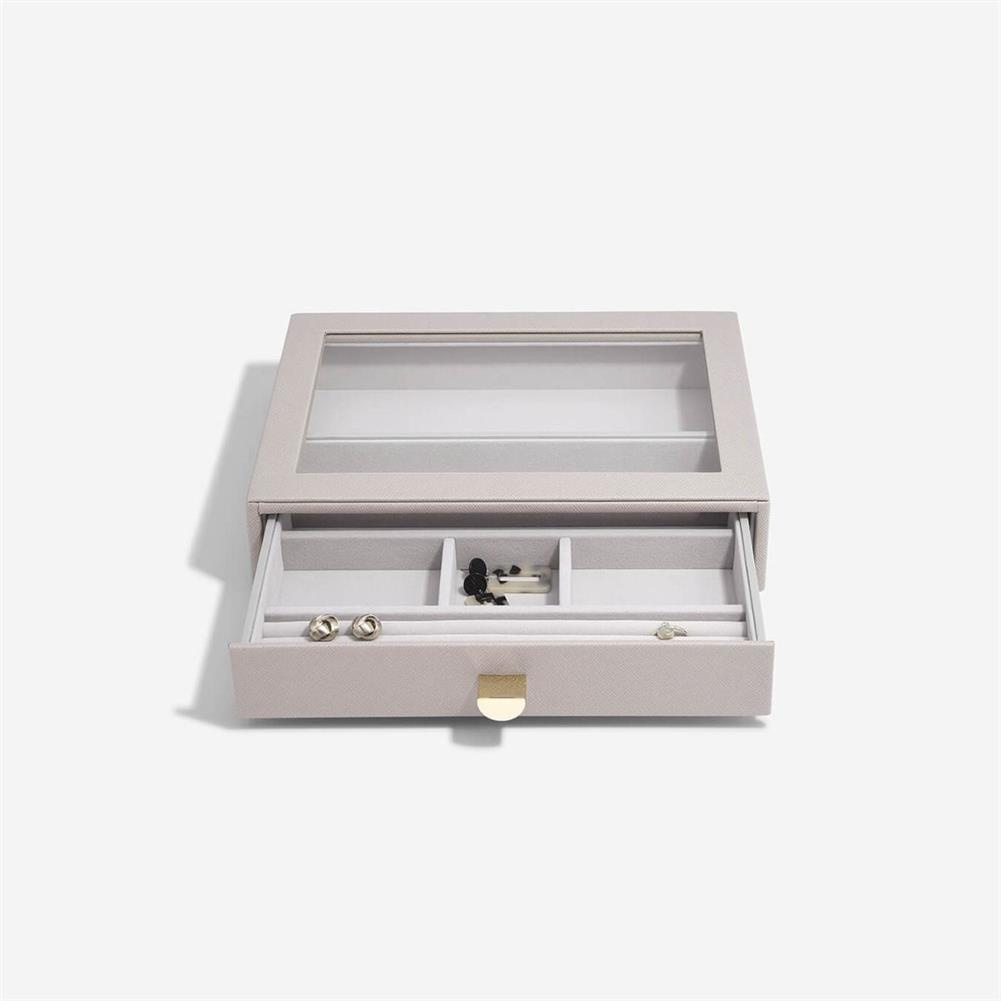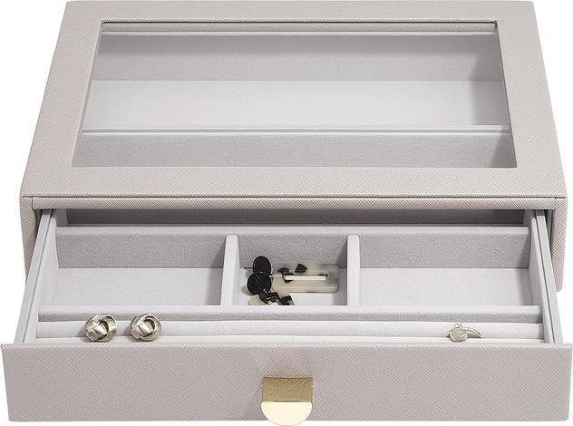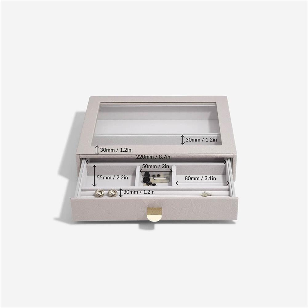 Nie będzie już wymówki dla braku organizacji Twojej biżuterii. Szkatułka na biżuterię Stackers classic z 2 szufladami jest idealna dla prawie każdej kolekcji. Gwarantuje dużą ilość miejsca na naszyjniki, pierścionki, kolczyki, zegarki i inne elementy, które będą pięknie zorganizowane i bezpieczne. Przezroczysta szklana pokrywa zapewnia widoczność i łatwy dostęp do ulubionych przedmiotów. Co więcej, możesz łatwo dodać kolejną warstwę szuflady na biżuterię, gdy Twoja kolekcja się powiększy! Pamiętaj, że możesz jeszcze lepiej dostosować swoje szuflady do potrzeb, dodając nowe warstwy i akcesoria.