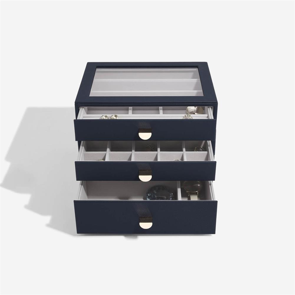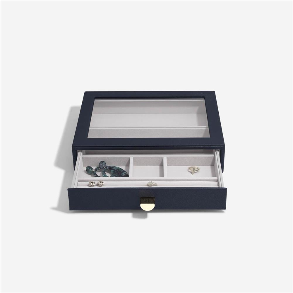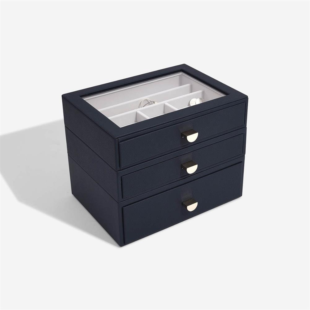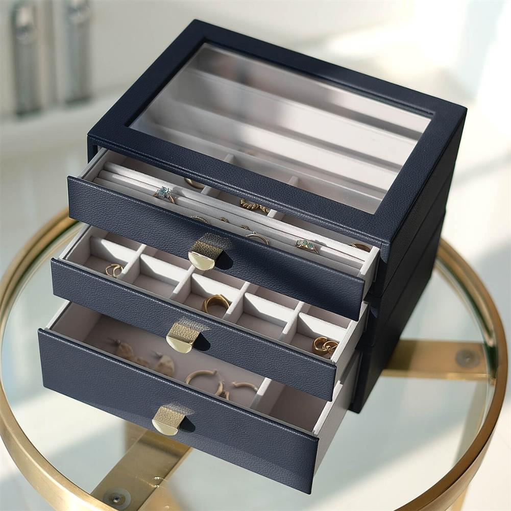 Koniec z gubieniem kolczyków i plątaniem się naszyjników! Szkatułka na biżuterię Stackers z 3 szufladami i szklaną pokrywką jest idealnym punktem wyjścia dla większej kombinacji lub jako samodzielny element. Szklana pokrywa pięknie wyeksponuje biżuterię a miękką aksamitną wyściółka zapewni jej bezpieczeństwo i ochronę. Utrzymuj swoje ulubione skarby w porządku dzięki uniwersalnym przegródkom na pierścionki, kolczyki, naszyjniki i bransoletki.