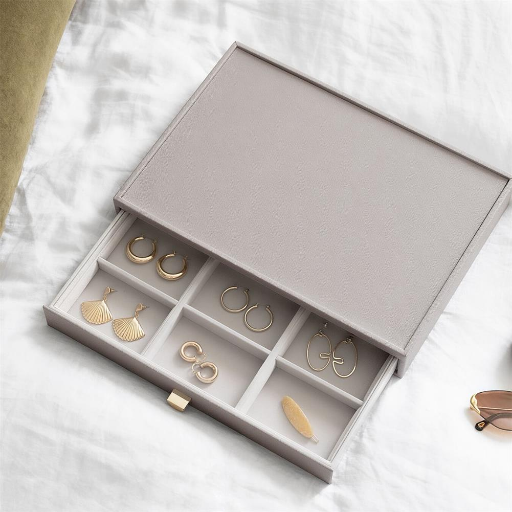 Nie będzie już żadnej wymówki dla braku organizacji Twoich skarbów! Szkatułka na biżuterię Stackers supersize taupe z 3 szufladami jest idealna dla prawie każdej kolekcji. Zapewnia dużą ilość miejsca na naszyjniki, pierścionki, kolczyki, zegarki i inne elementy, które będą pięknie zorganizowane i bezpieczne. Przezroczysta pokrywa zapewnia widoczność i łatwy dostęp do ulubionych przedmiotów. Co więcej, możesz łatwo dodać kolejną warstwę, gdy Twoja kolekcja się powiększy.