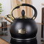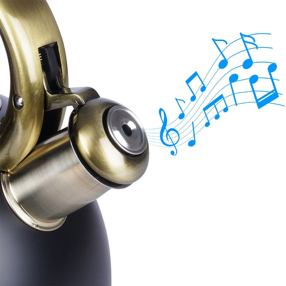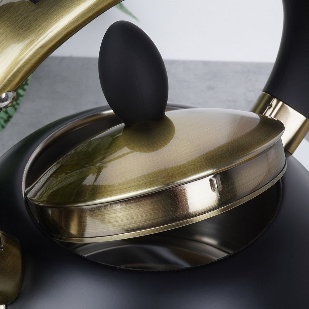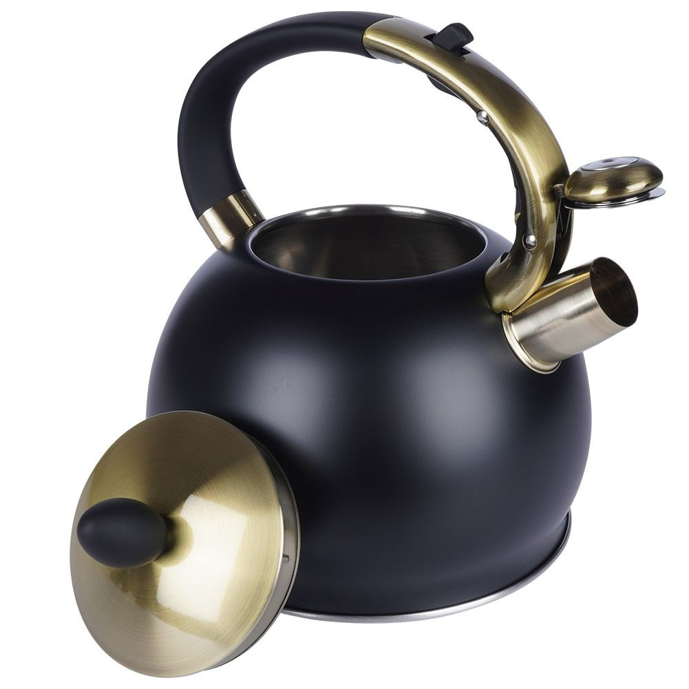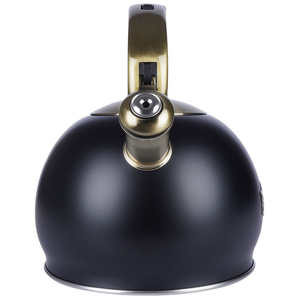 - STALOWY - Klasyczny czajnik wykonany z najwyższej jakości stali nierdzewnej. Niezwykłe połączenie matowej czerni z postarzanym złotem. Stal nierdzewna jest trwała oraz neutralna dla podgrzewanej wody, nie wpływa w żaden sposób na jej właściwości. Posiada automatyczny gwizdek oraz zdejmowaną pokrywkę. Czajnik ma pojemność całkowitą 3 litry oraz wysokość 22,5 cm, pojemność użytkowa wynosi 2,5 litra.