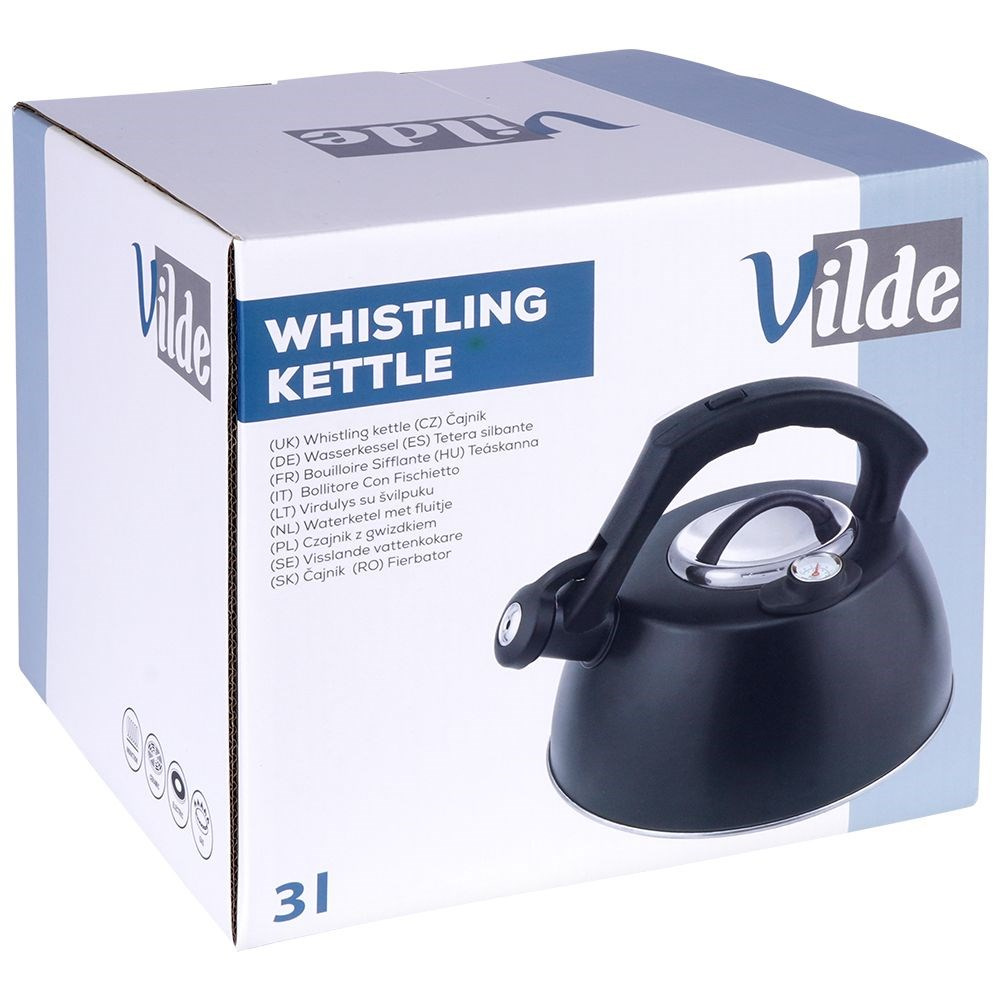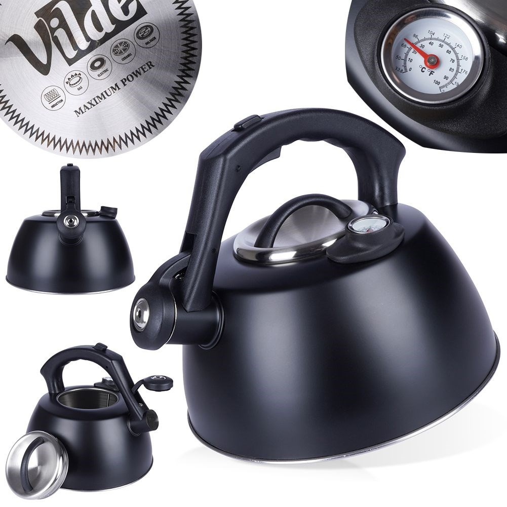 Czajnik z termometrem wykonany z najwyższej jakości materiałów. Wykorzystamy go do zagotowania wody na kawę, herbatę czy do zaparzenia ziół. Wygodny w użytkowaniu, dzięki rączce, pokrywce oraz automatycznemu gwizdkowi. Termometr pozwoli na parzenie herbat i ziół w odpowiednich temperaturach: herbatę czarną należy zaparzać w temperaturze 90-95°C, herbatę zieloną 75-85°C, herbatę białą 70-80°C, herbatę żółtą 80-85°C, herbatę ziołową 95-100°C, zioła najlepiej zaparzać w temperaturze 95°C. Wodę w czajniku zagotujemy bardzo szybko, a czyszczenie go jest bardzo wygodne. Czajnik jest świetnym pomysłem na prezent. UWAGA! Czajnik do gotowania musi być napełniony co najmniej do połowy aby zapobiec przegrzaniu. Zmiany koloru na powierzchni zewnętrznej w przypadku nieprzestrzegania minimalnych parametrów użytkowych nie mogą być powodem do reklamacji. Oryginalny produkt marki Vilde. Wyprodukowano zgodnie z europejskimi standardami.
