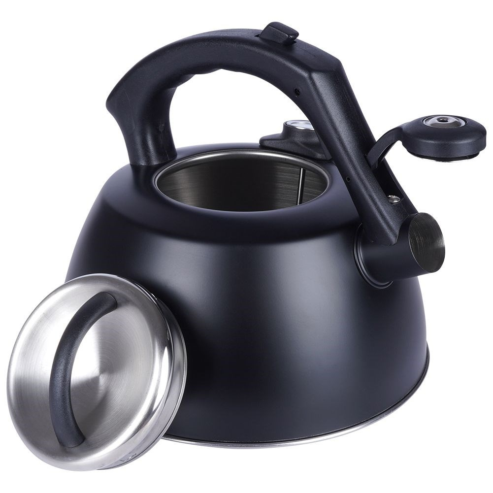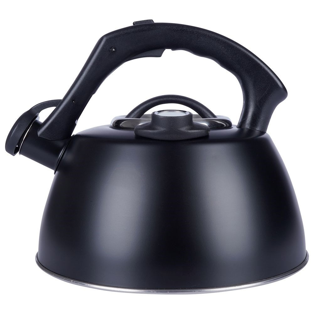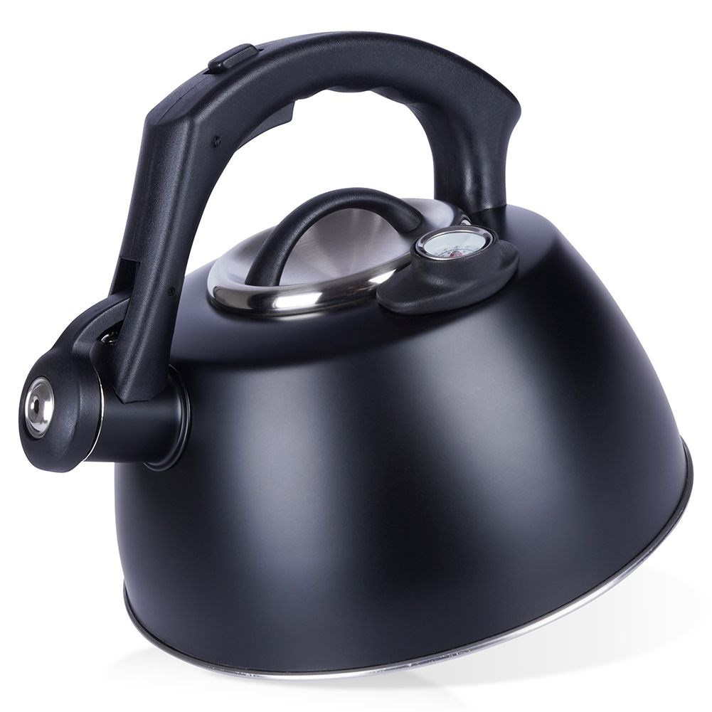- STALOWY - Klasyczny czajnik wykonany z najwyższej jakości stali nierdzewnej. Utrzymany w czarnym, matowym kolorze. Stal nierdzewna jest trwała oraz neutralna dla podgrzewanej wody, nie wpływa w żaden sposób na jej właściwości. Posiada automatyczny gwizdek, termometr oraz zdejmowaną pokrywkę. Czajnik ma pojemność całkowitą 3 litry oraz wysokość 20 cm, pojemność użytkowa wynosi 2,2 litra.