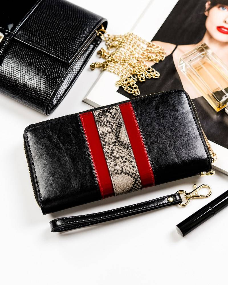 • Niebanalny design | Portfel o modnym fasonie. Przez środek biegnie pas wykonany ze wzoru imitującego skórę węża oraz towarzyszące mu dwie lakierowane wstawki. Model w orientacji poziomej zapinany na zamek. Portfel typu piórnik stanie się świetnym towarzyszem każdego dnia!