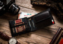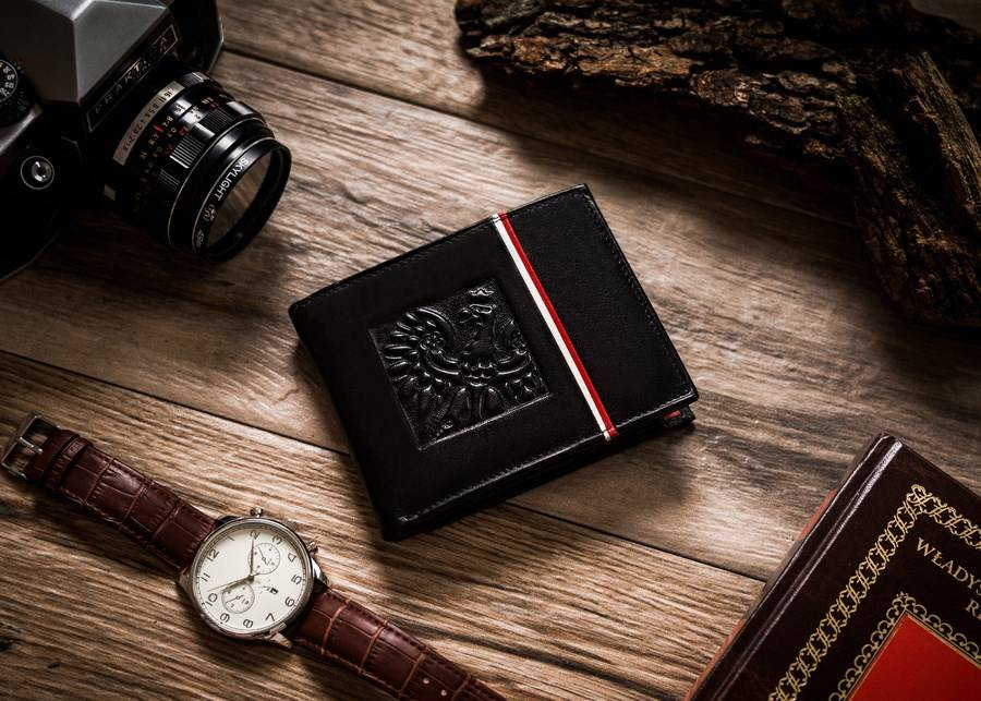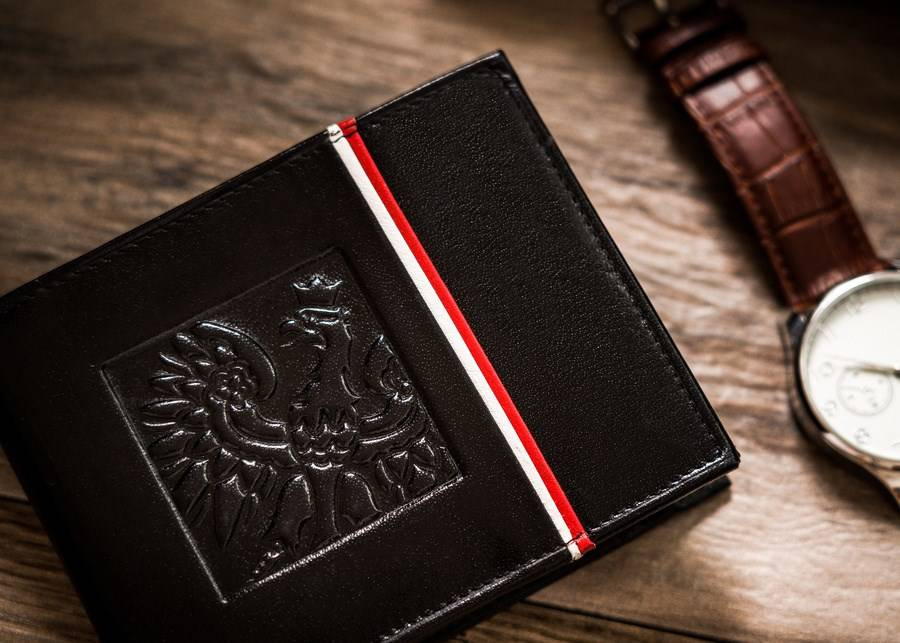 - Patriotyczny dodatek | Portfel o klasycznej stylistyce. Model w orientacji poziomej bez zapięcia zewnętrznego. Na froncie mieści się delikatny motyw biało-czerwonej flagi oraz wizerunek godła Polski.