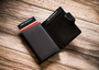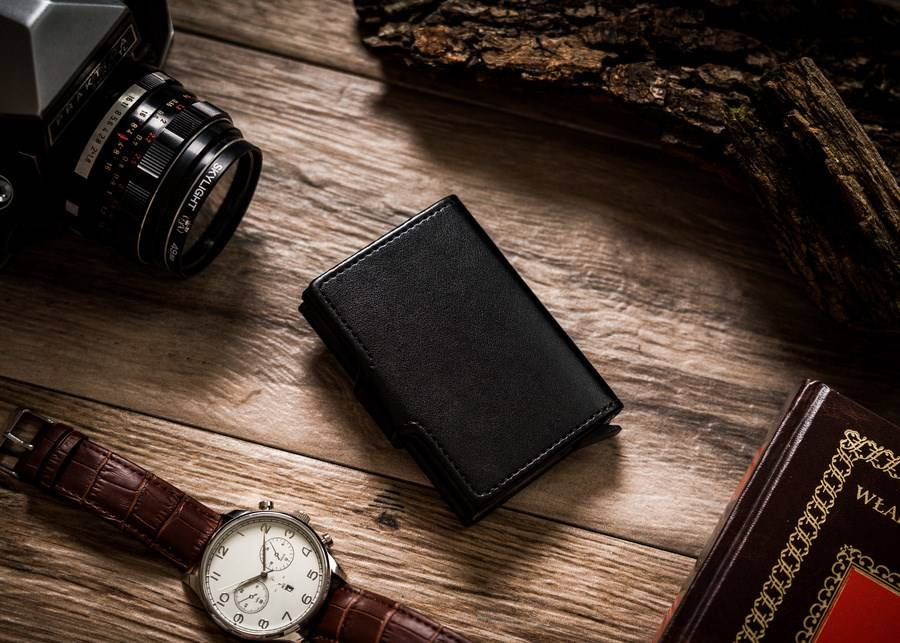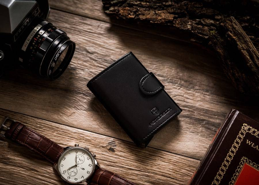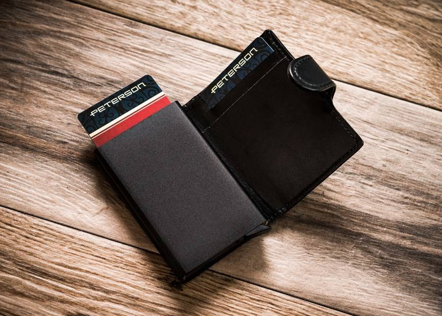 Portfel wyposażony w ochronne etui na karty z inteligentnym systemem do ich łatwego wysuwania - wystarczy pociągnąć za małą dźwigienkę, a karty natychmiast się wysuną. Wykonano je z aluminium, chroni karty przed zgięciem, łamaniem oraz niechcianymi transakcjami zbliżeniowymi (technologia RFID BLOCKING SYSTEM)