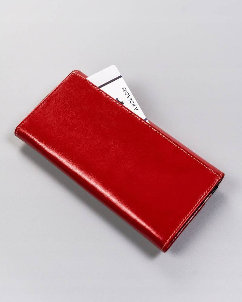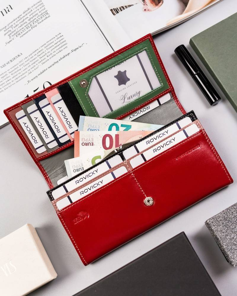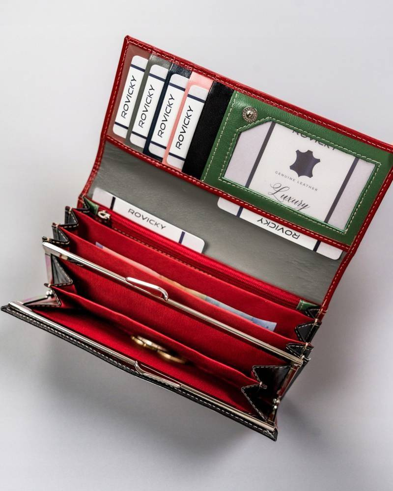 - 2 kieszonki na dokumenty w większym formacie, jak dowód rejestracyjny w okładce. Jedna z tych kieszonek mieści się po zewnętrznej części, z tyłu portfela i jest otwarta. Zalecamy jednak, by ważne dokumenty przechowywać wewnątrz, zamykanego napą portfela.