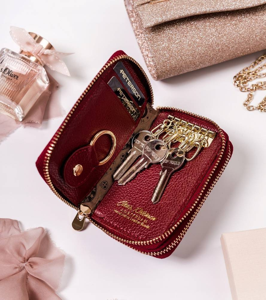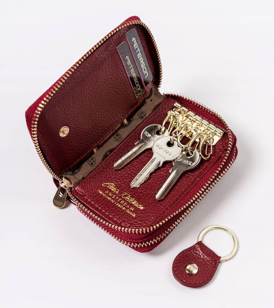Pojemne etui na klucze z oddzielną sekcją wyposażoną w kieszenie na bilon, banknoty i karty płatnicze.