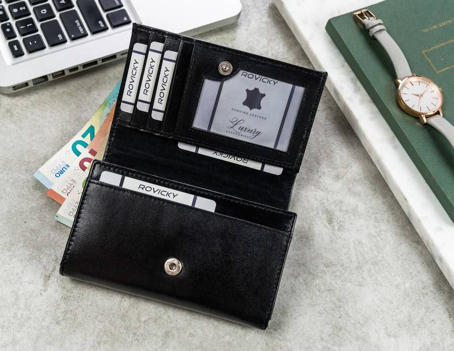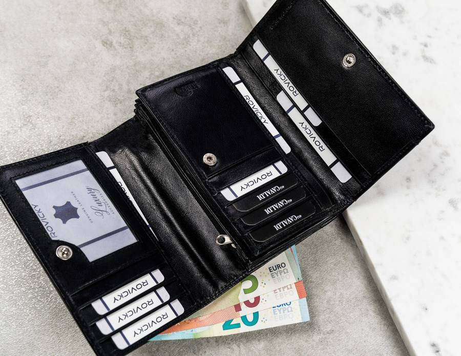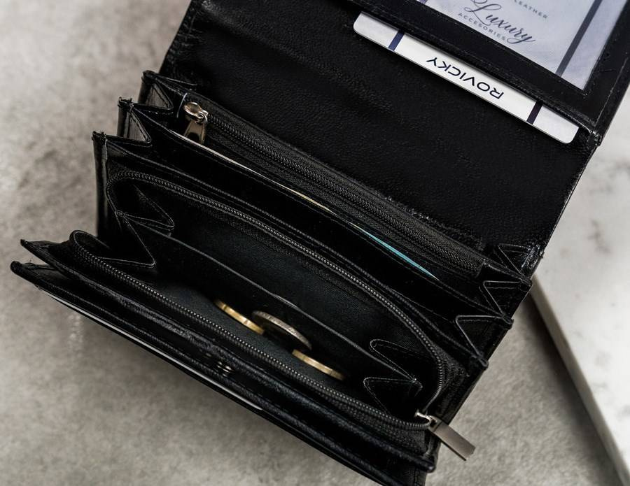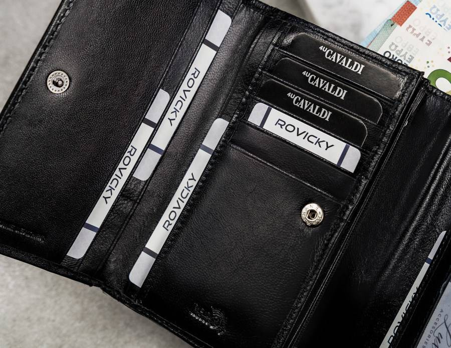 - 6 kieszonek na dokumenty w większym formacie, jak dowód rejestracyjny w okładce. Dwie z tych kieszonek mieszczą się po zewnętrznej części, z tyłu portfela, jedna z nich jest otwarta, druga zamknięta na zameczek. Zalecamy jednak, by ważne dokumenty przechowywać wewnątrz, zamykanego napą portfela.
