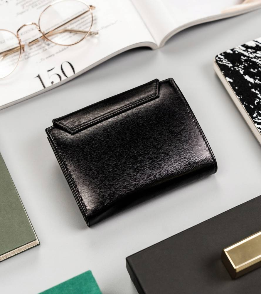- Oryginalny wygląd | Portfel o klasycznej stylistyce w zmysłowym, klasycznym czarnym kolorze. Model w orientacji pionowej, zapinany klapką na zatrzask.