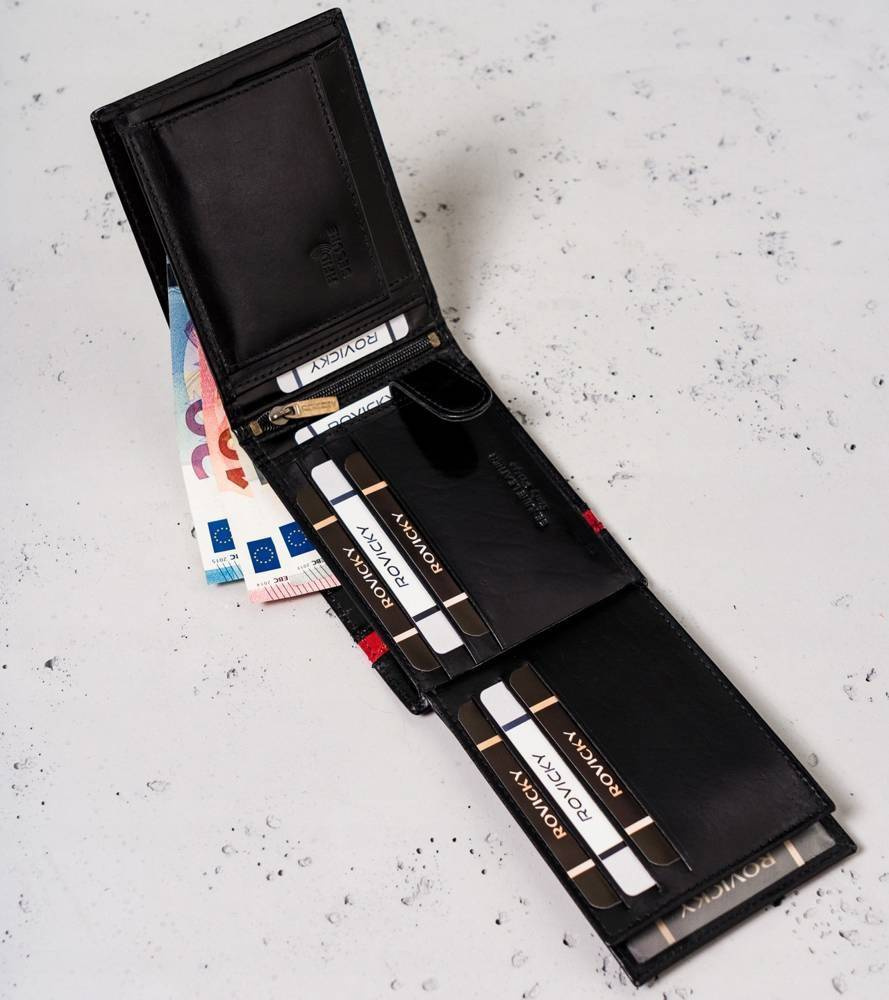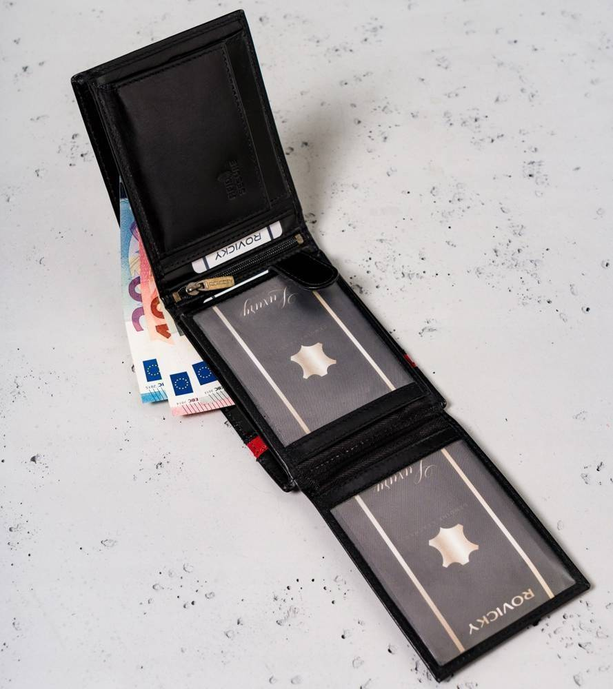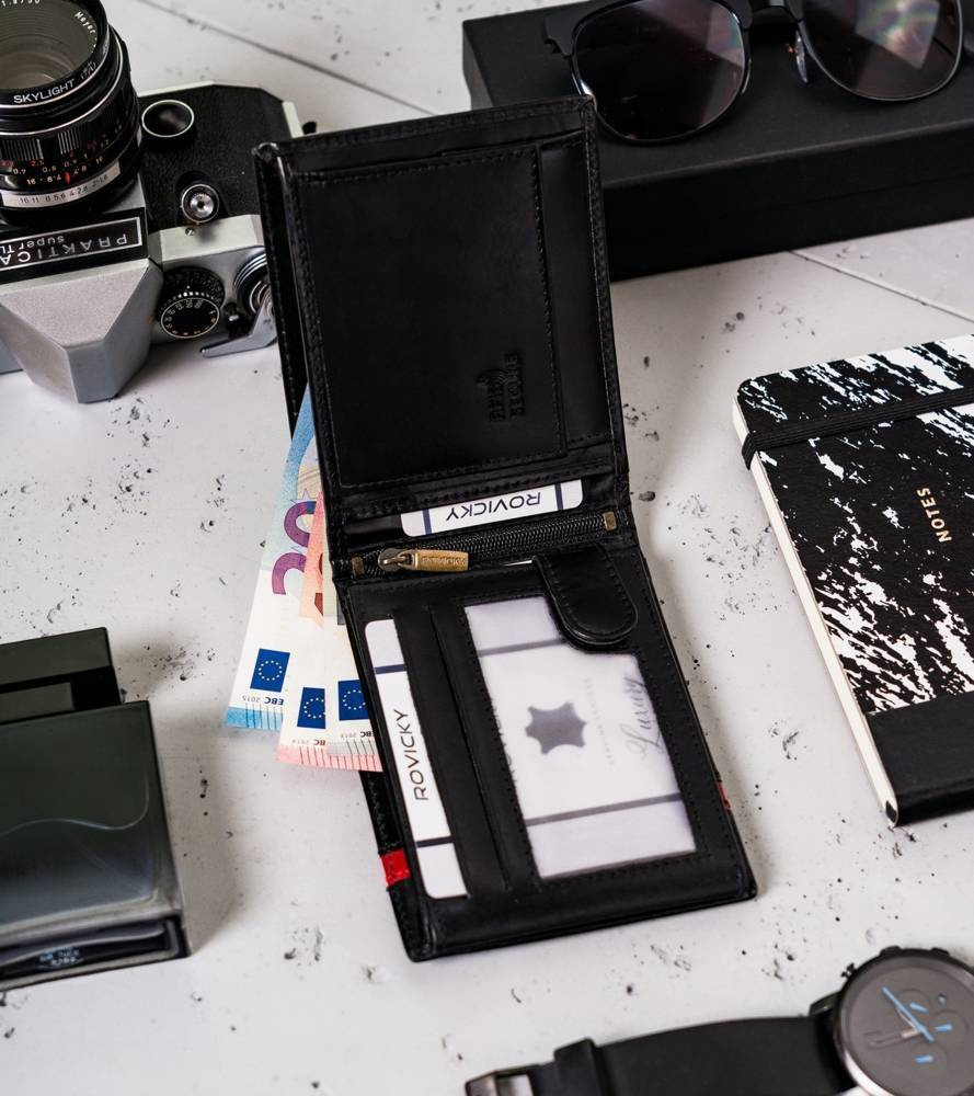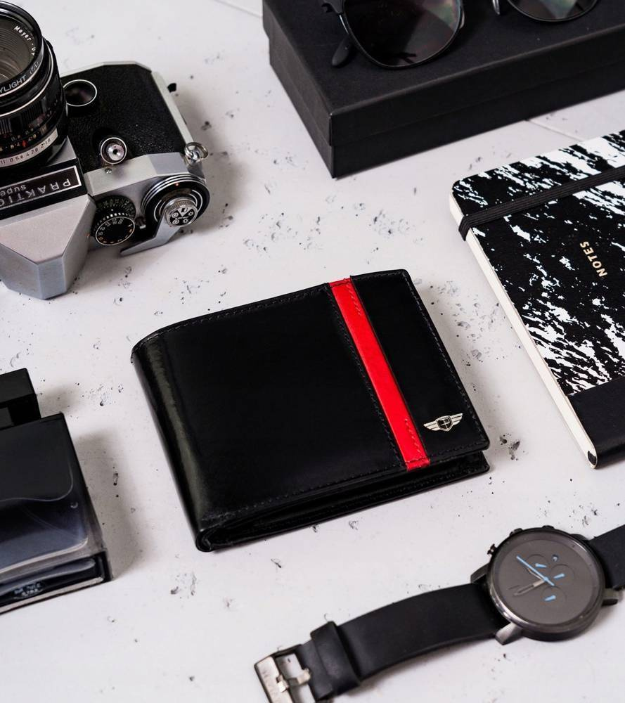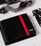 Klasyczny design | Czarny kolor to klasyka, a portfel w tym kolorze daje poczucie komfortu i świadomość, że możesz poczuć się modnie. Front portfela zdobi elegancki czerwony pasek