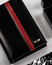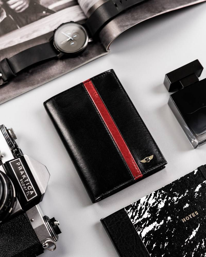 - Elegancki fason, który nigdy nie wyjdzie z mody | Czarny kolor to klasyka, a portfel w tym kolorze daje poczucie komfortu i świadomość, że możesz poczuć się modnie. Front portfela zdobi elegancki czerwony pasek