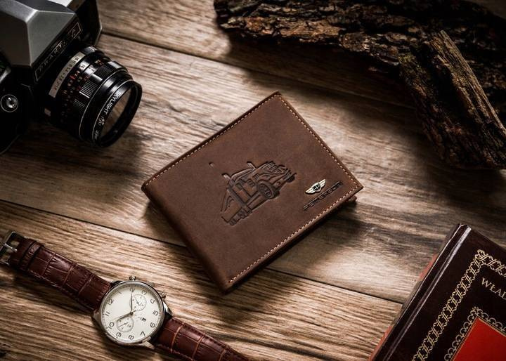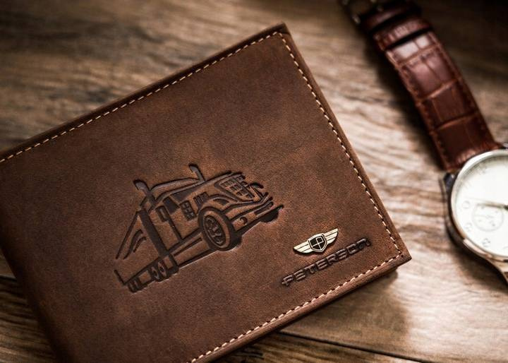 - Stylowy dodatek dla fana ciężarówek | Portfel o klasycznej stylistyce. Model w orientacji poziomej bez zapięcia zewnętrznego z wytłoczoną ciężarówką na froncie