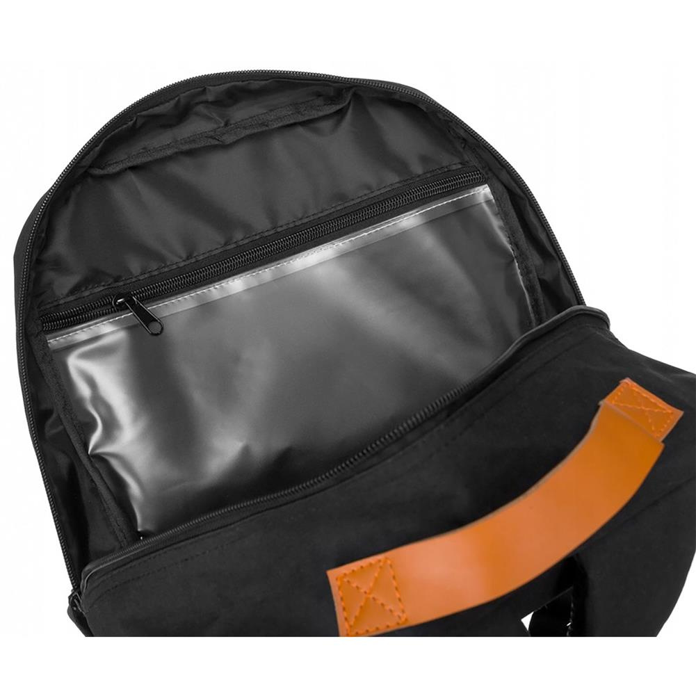 - jednokomorowy z aż sześcioma kieszeniami wewnętrznymi i trzema zewnętrznymi
