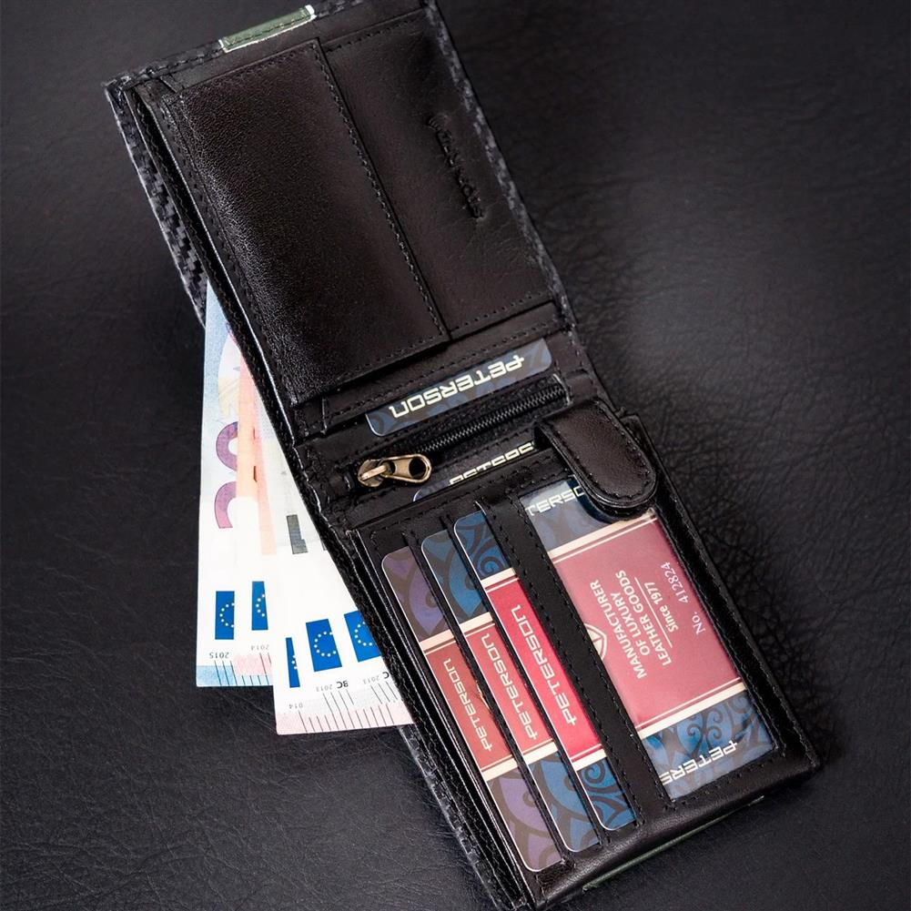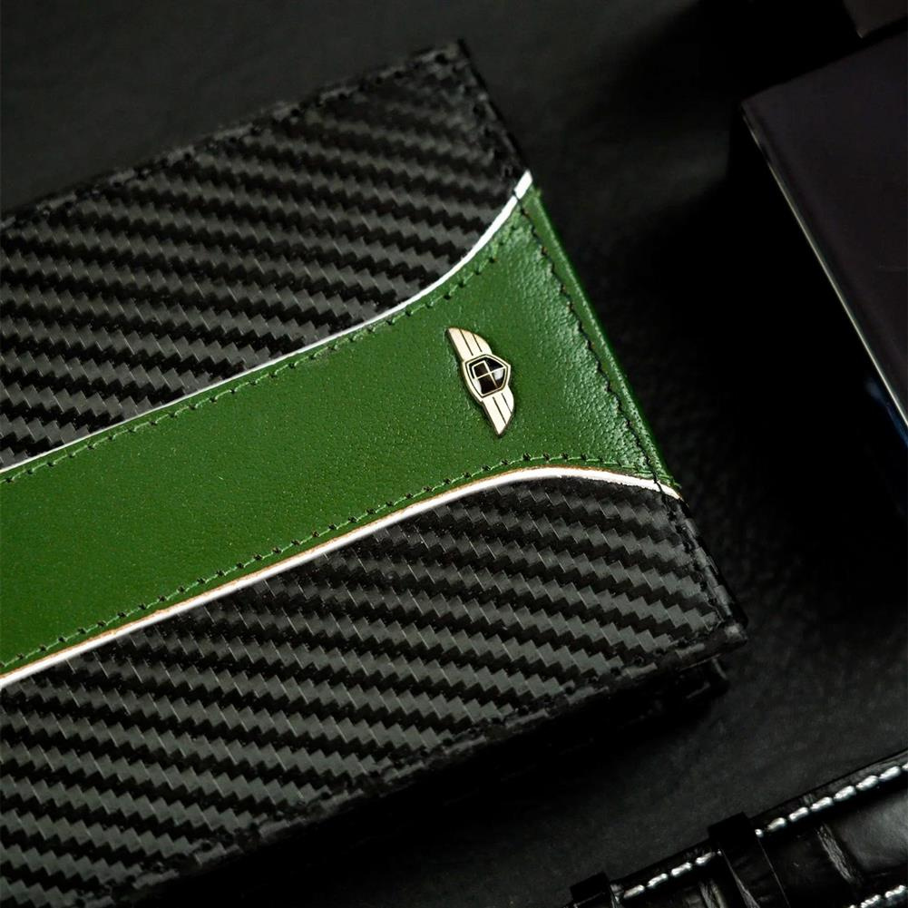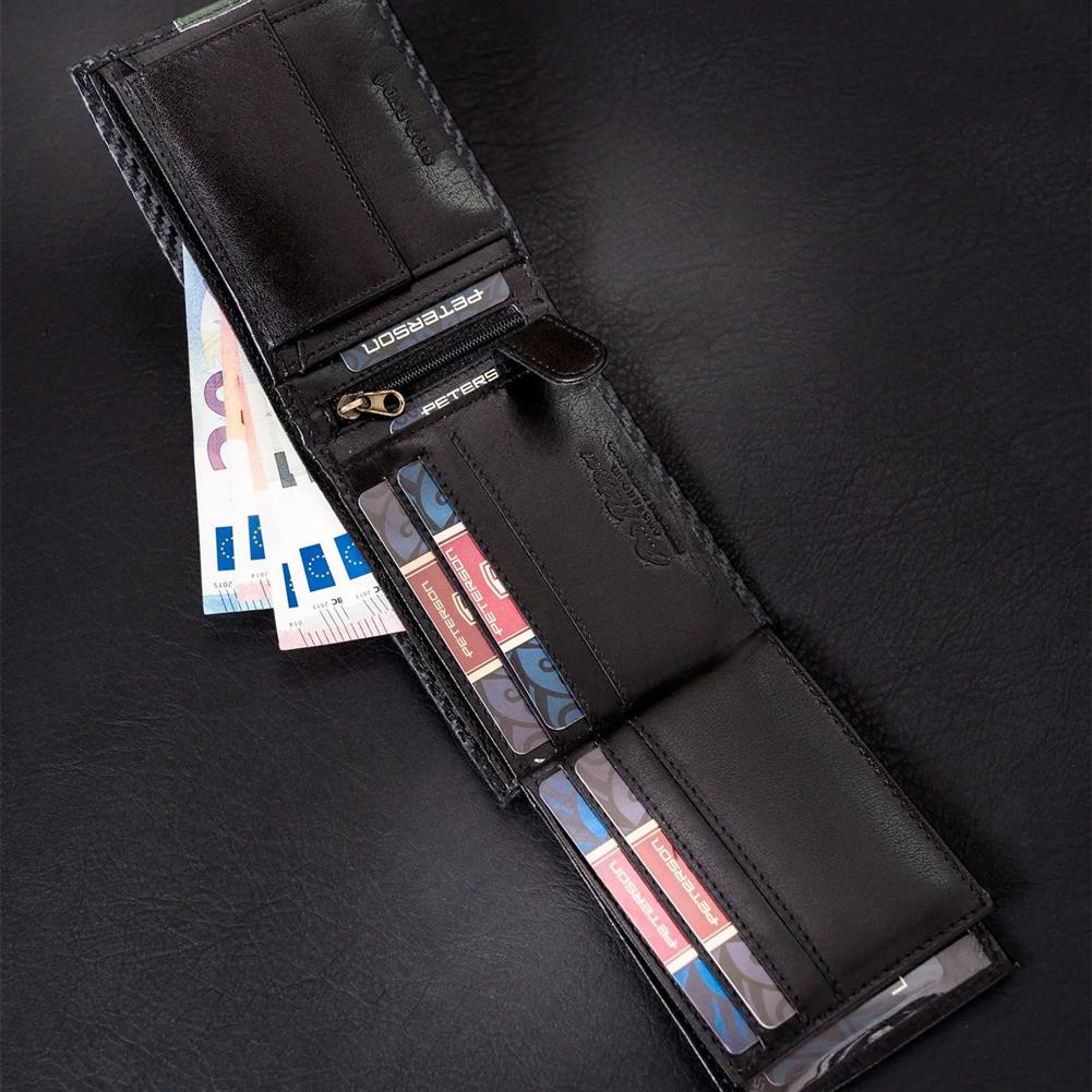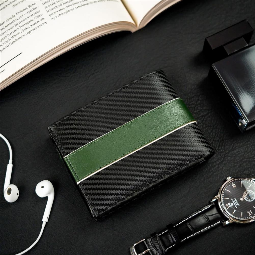 • Oszałamiający design | Portfel o klasycznym poziomym fasonie i rewelacyjnym wykończeniu - z zewnątrz powleczony warstwą do złudzenia przypominającą włókno węglowe (carbon), a dodatkowo ozdobiony zieloną wstawką, przeszytą przez całą jego szerokość;