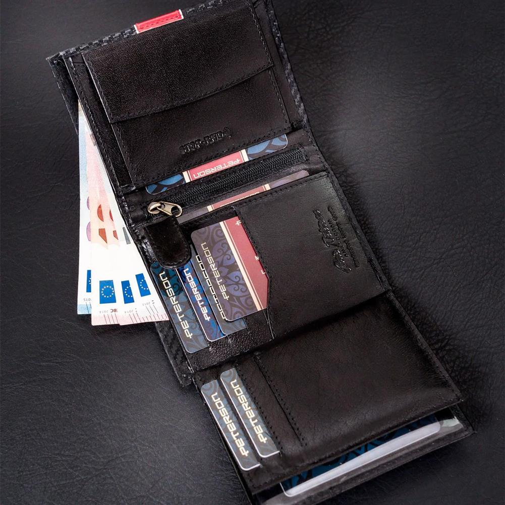 - Ponadczasowy design | Portfel o klasycznym pionowym fasonie i rewelacyjnym wykończeniu - z zewnątrz powleczony warstwą do złudzenia przypominającą włókno węglowe (carbon) oraz dwoma czerwonymi pasami biegnącymi przez całą jego szerokość;
