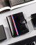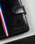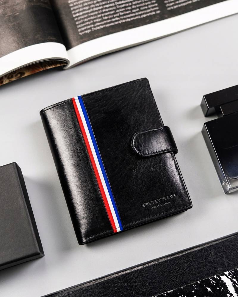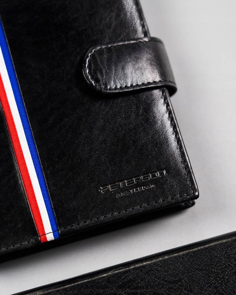 - Modny design | Odszyty bardzo trwale z doskonałej jakości gładkiej skóry naturalnej w czarnym kolorze, dodatkowo na froncie portfela wyszyto trójkolorowy paseczek;