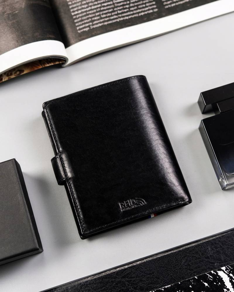 - Zapinany na zatrzask | Duży portfel o klasycznej stylistyce. Model w orientacji pionowej z zapięciem zewnętrznym na zatrzask;