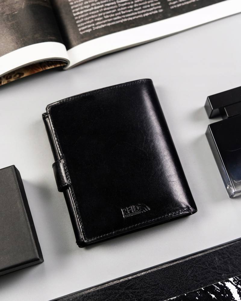 - Zapinany na zatrzask | Duży portfel o klasycznej stylistyce. Model w orientacji pionowej z zapięciem zewnętrznym na zatrzask;