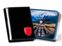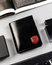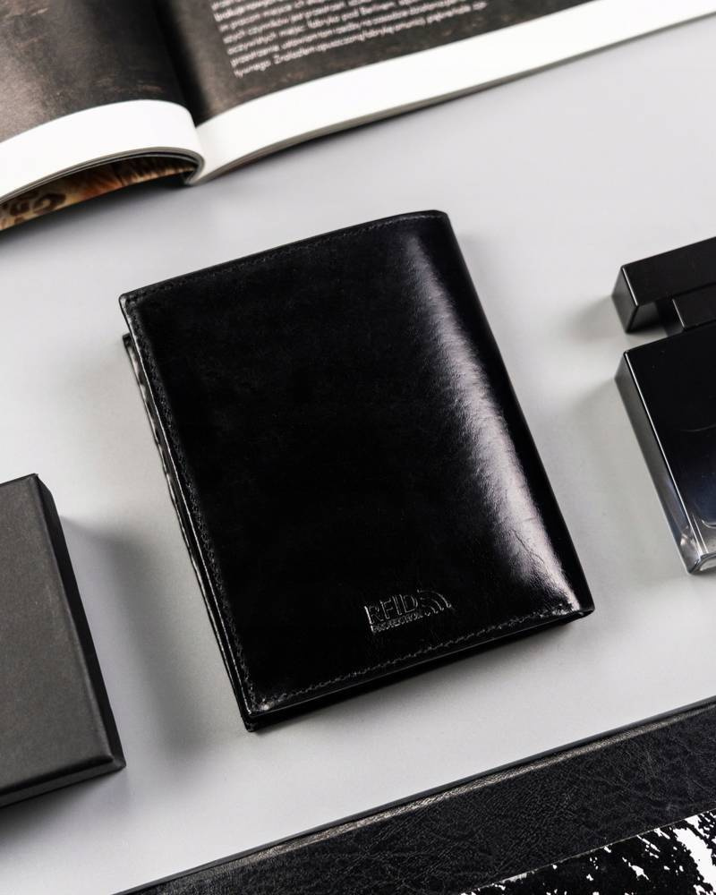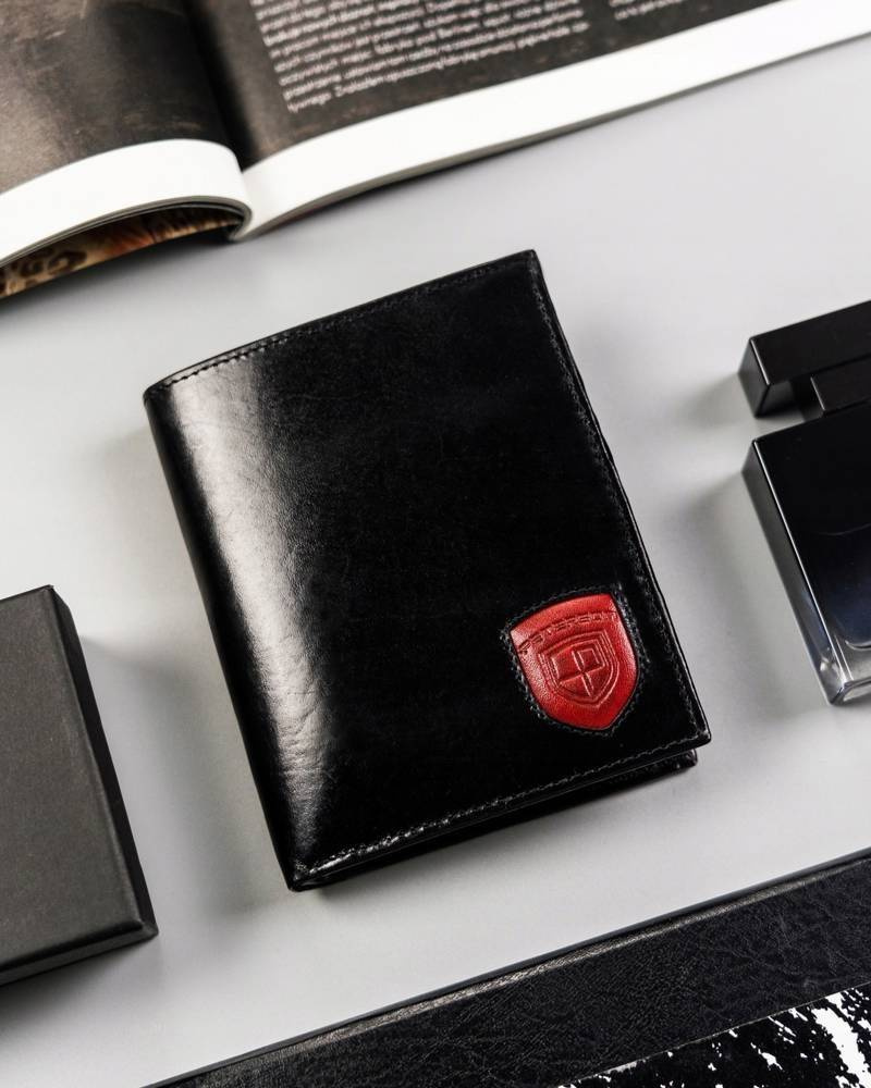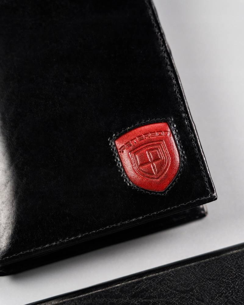 • Modny design | Odszyty bardzo trwale z doskonałej jakości gładkiej skóry naturalnej w czarnym kolorze, dodatkowo na froncie portfela wyszyto trójkolorowy paseczek;