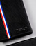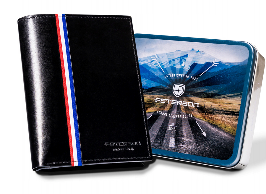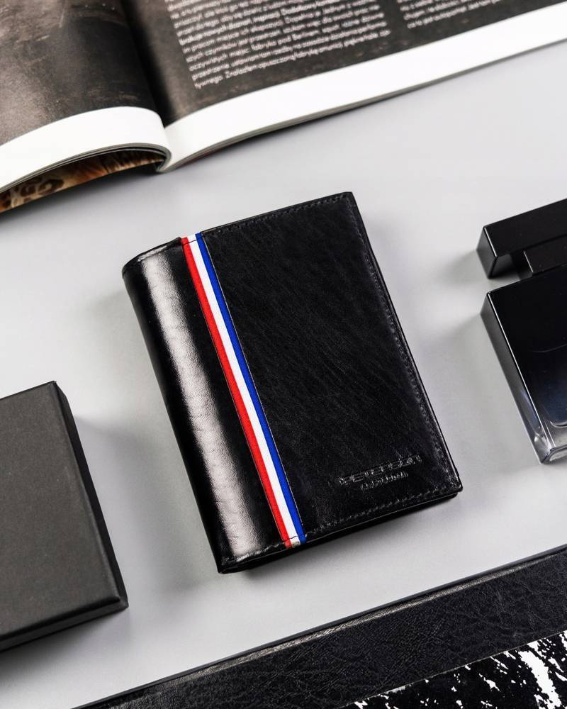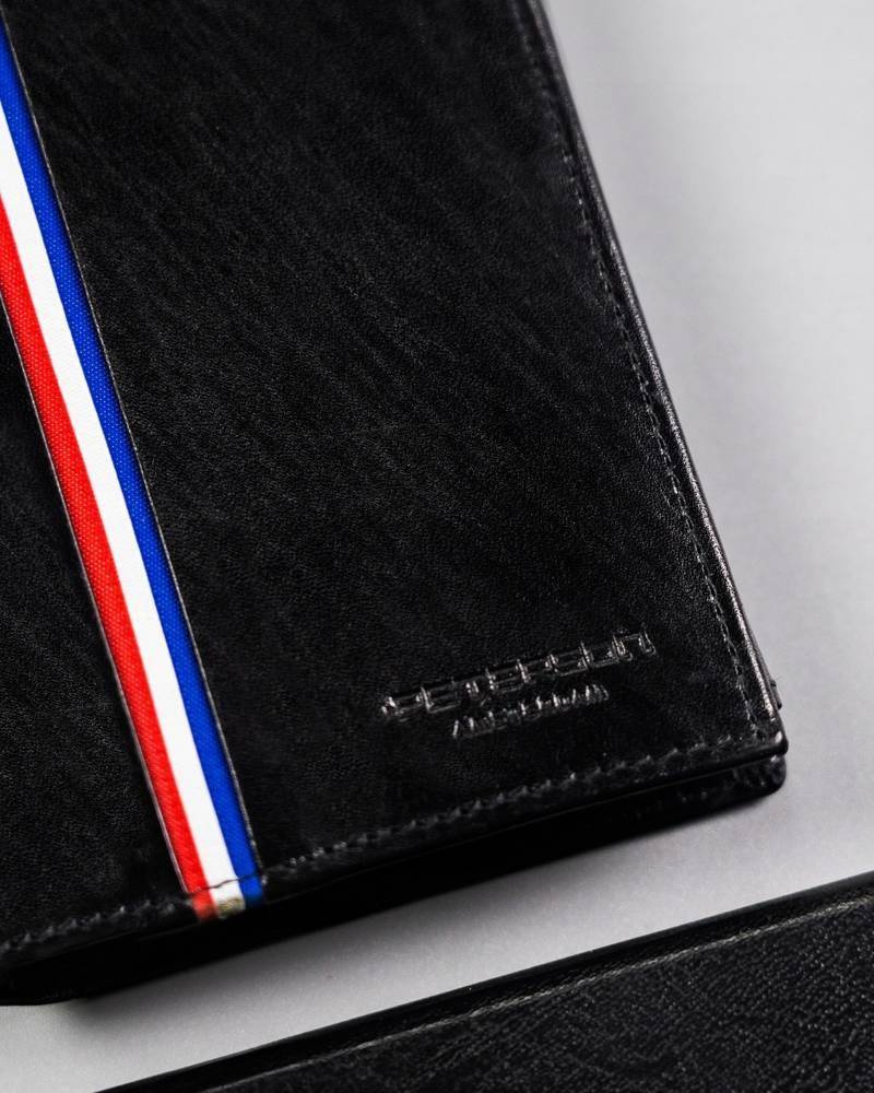 - Modny design | Odszyty bardzo trwale z doskonałej jakości gładkiej skóry naturalnej w czarnym kolorze, dodatkowo na froncie portfela wyszyto trójkolorowy paseczek;