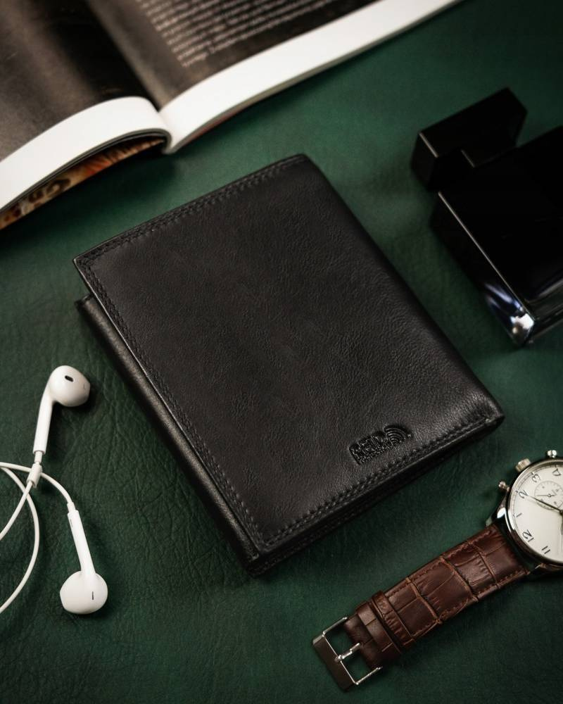 - Skórzana elegancja | Portfel męski w orientacji pionowej w czarnym, zawsze modnym kolorze;