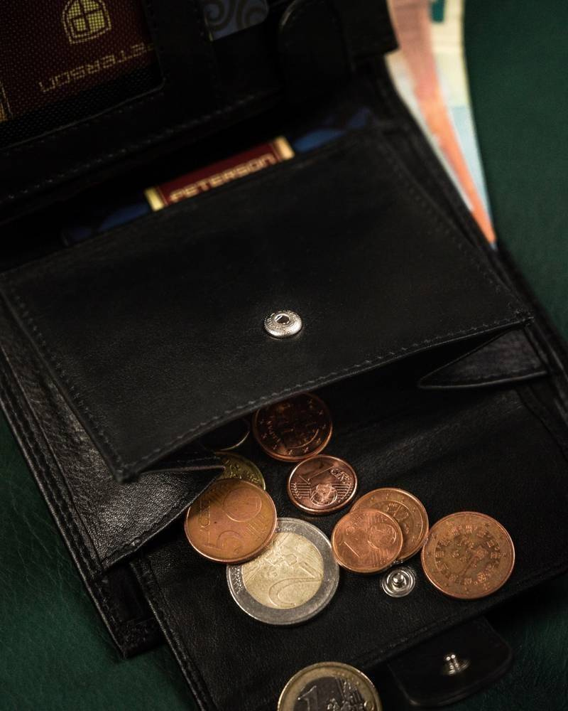 banknoty schowasz do 2 otwartych przegródek wyszytych po całej szerokości portfela.