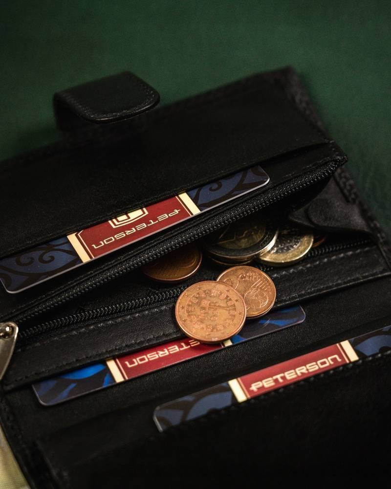 - banknoty schowasz do 1 otwartej przegródki wyszytej po całej szerokości portfela