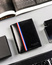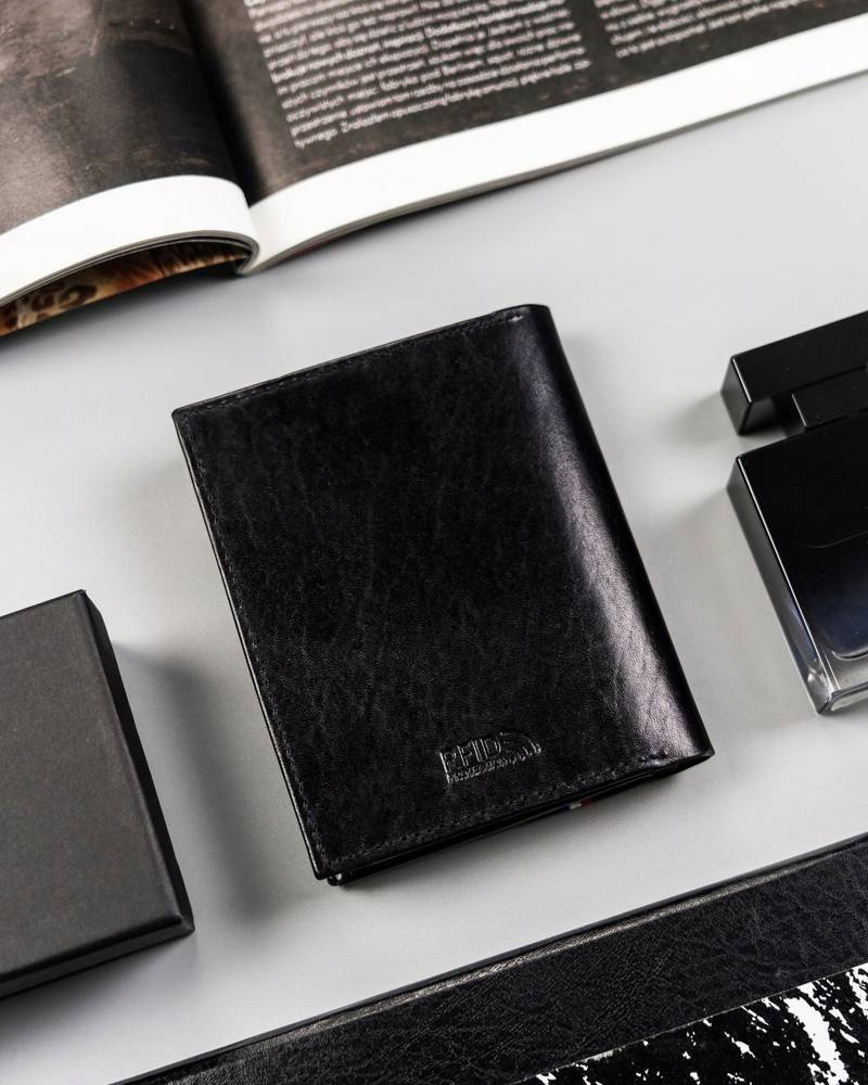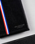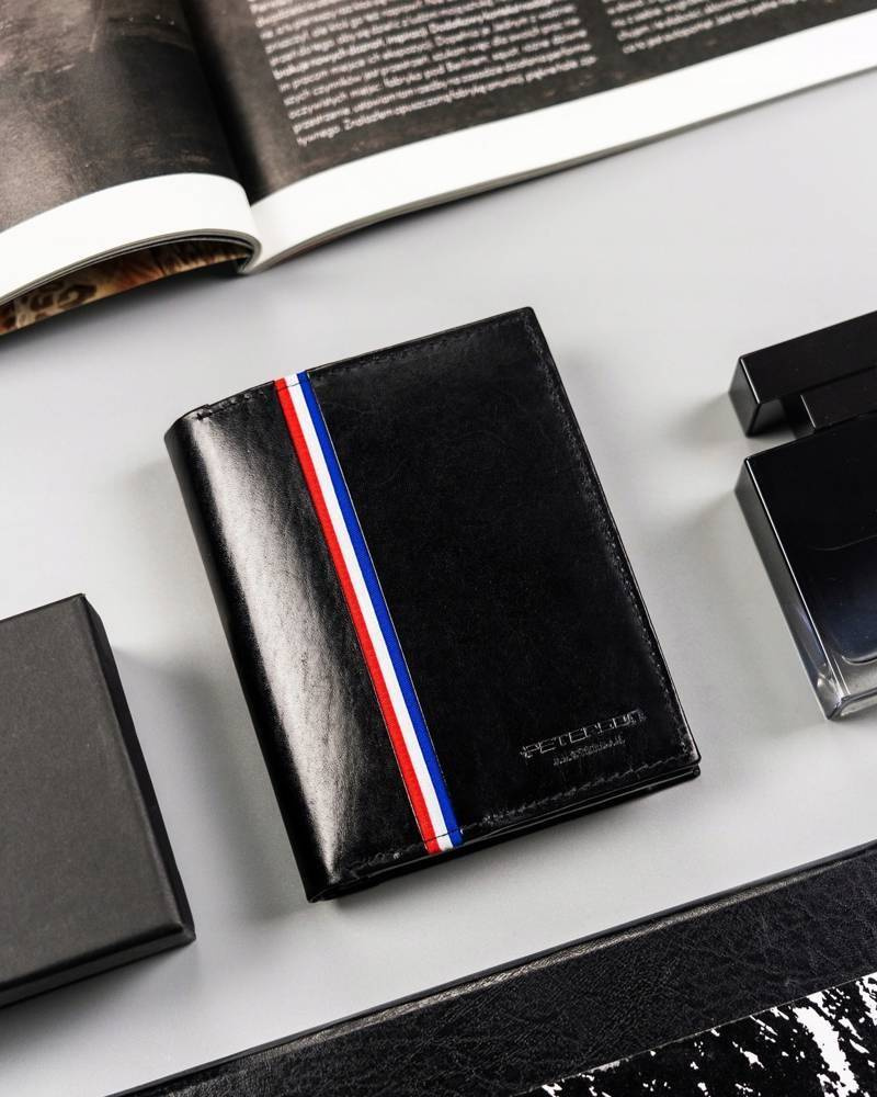• Ergonomiczny design | Odszyty bardzo trwale z doskonałej jakości gładkiej skóry naturalnej w czarnym kolorze, dodatkowo na froncie portfela wyszyto trójkolorowy paseczek;