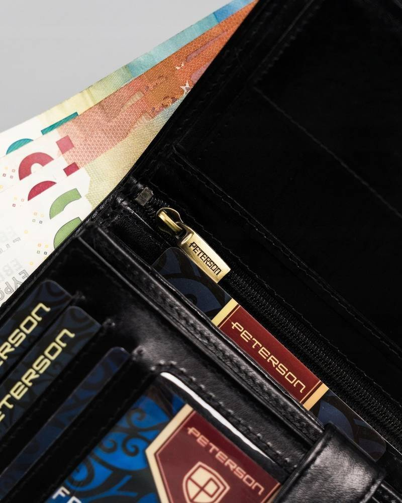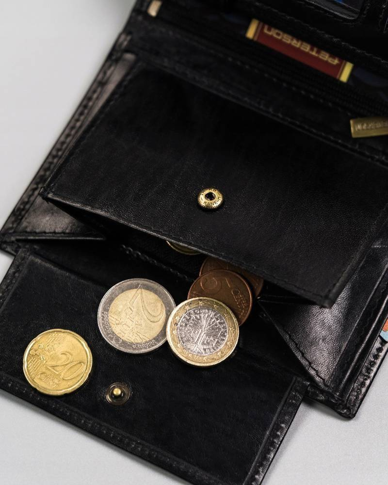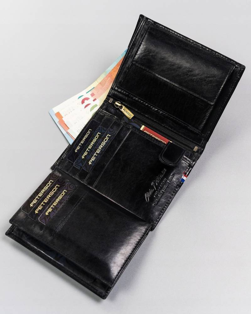 • banknoty schowasz do 2 otwartych przegródek wyszytych po całej szerokości portfela.